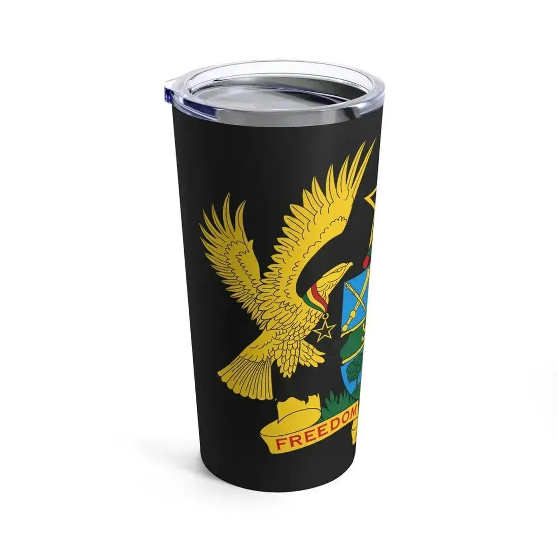 This 20oz tumbler showcases the Coat of Arms of Ghana, a symbol deeply rooted in the rich history and culture of this West African nation. The design beautifully encapsulates Ghana's unity, freedom, and progress. At its center lies a gold star, representing the nation's status as the first independent country in sub-Saharan Africa. Flanking either side are a princely coronet symbolizing the Ashanti Kingdom, and a traditional Krobo stool, emblematic of the tribal states. A bi-color border, reflecting Ghana's black majority and minority ethnic groups, encircles the central emblems. This tumbler is perfect for anyone who appreciates unique and cool drinkware, as well as individuals with an affinity for African history or cultural motifs.