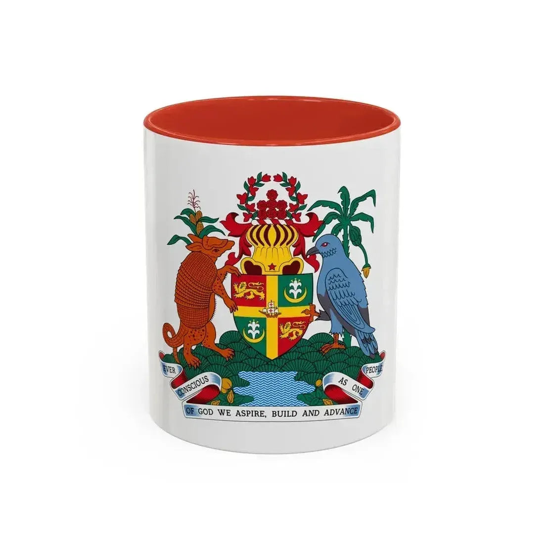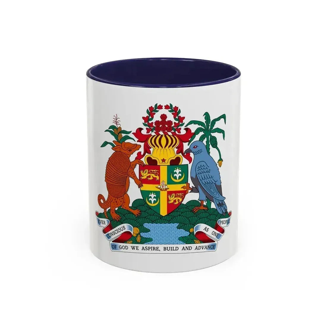 Delve into Caribbean history with this unique Coat of Arms of Grenada Accent Coffee Mug. This design features the official heraldry of Grenada, a symbol deeply rooted in the island's rich heritage. The shield is adorned with three pioniers, representing the island's indigenous people, alongside a cocoa pod and an anchor - symbols of agriculture and maritime history. The mottos "Je me souviens" (I remember) and "For God and Country" encircle the shield, reminding us of Grenada's strength and devotion. Perfect for anyone who appreciates unique and cool drinkware, as well as those with a passion for Caribbean culture or history.
