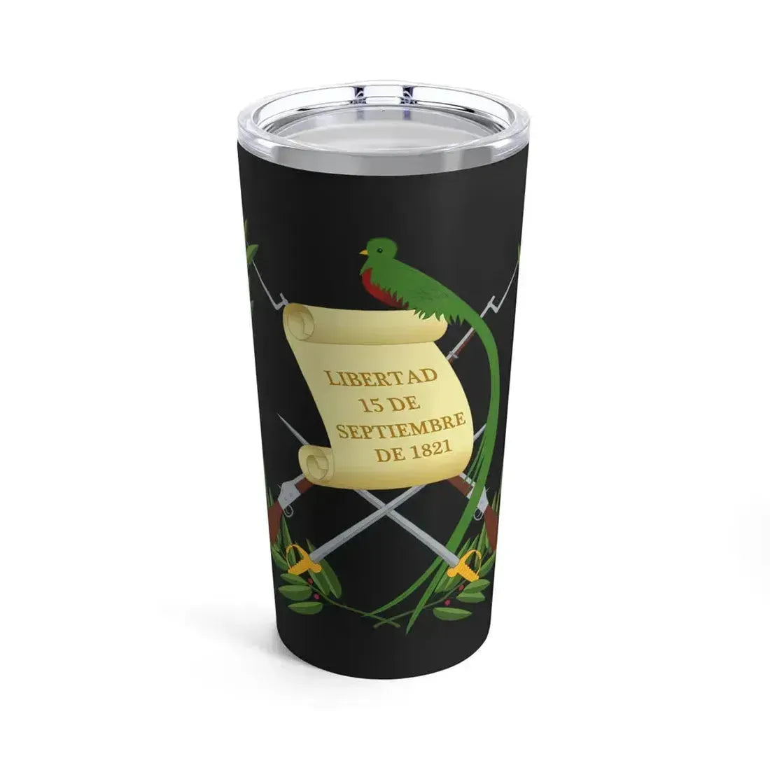 This 20oz tumbler showcases the Coat of Arms of Guatemala, a symbol rich in historical and cultural significance. The design features the national bird, a quetzal, perched atop a shield adorned with three volcanoes representing Tajumulco, Fuego, and Acatenango. The shield also showcases the Mayan cross, a representation of Christianity's influence on the Guatemalan people. The motto "Libre, Soberano e Unido" (Free, Sovereign and United) is inscribed at the bottom, reflecting the nation's dedication to independence and unity. This tumbler is perfect for anyone who appreciates unique and cool drinkware, as well as those with a keen interest in Guatemalan culture and history.