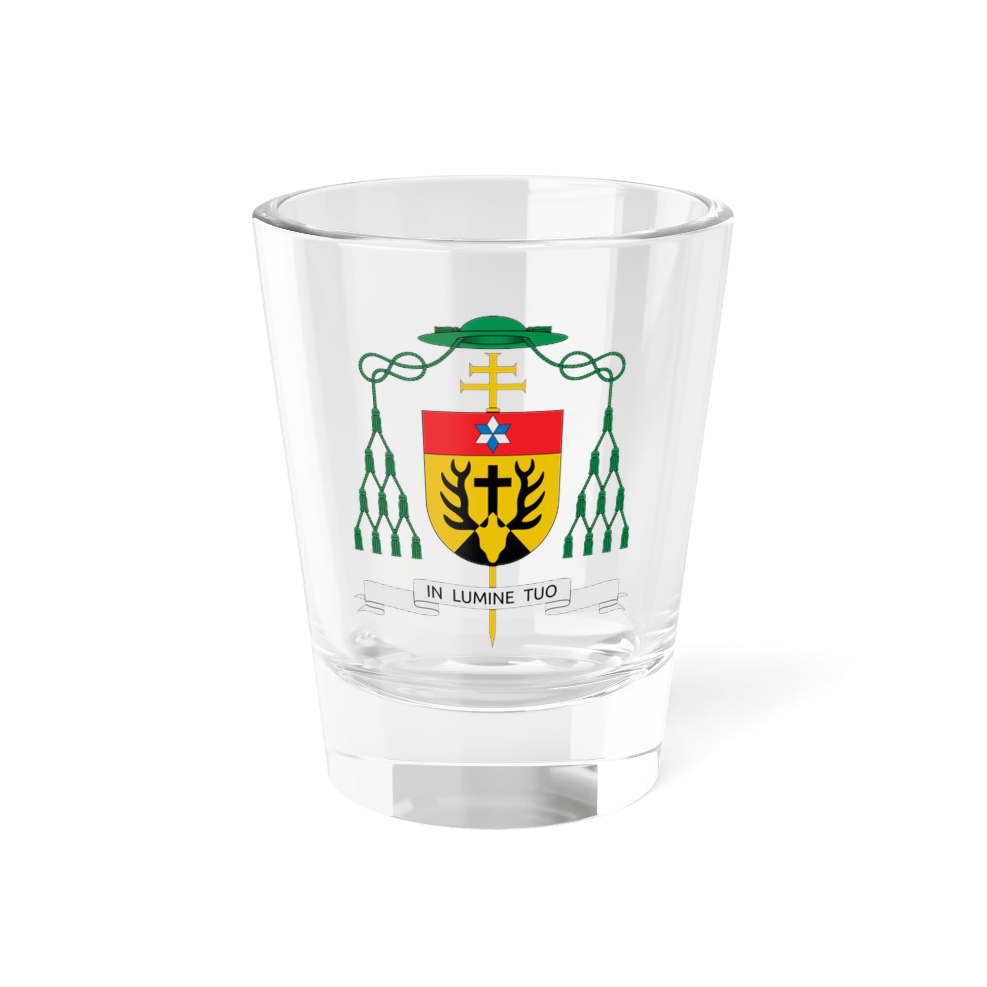 This shot glass showcases the intricate coat of arms of Archbishop Hubertus van Megen, a visual tapestry woven with heraldic significance.