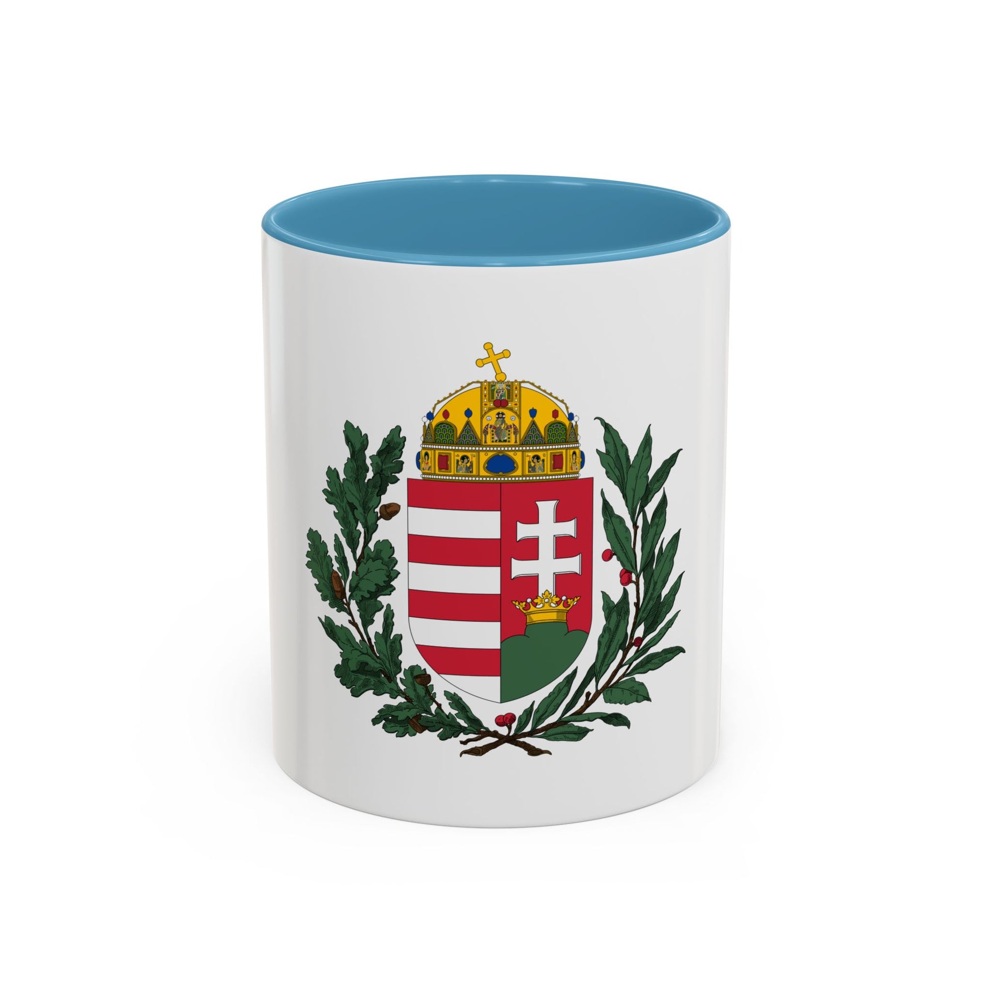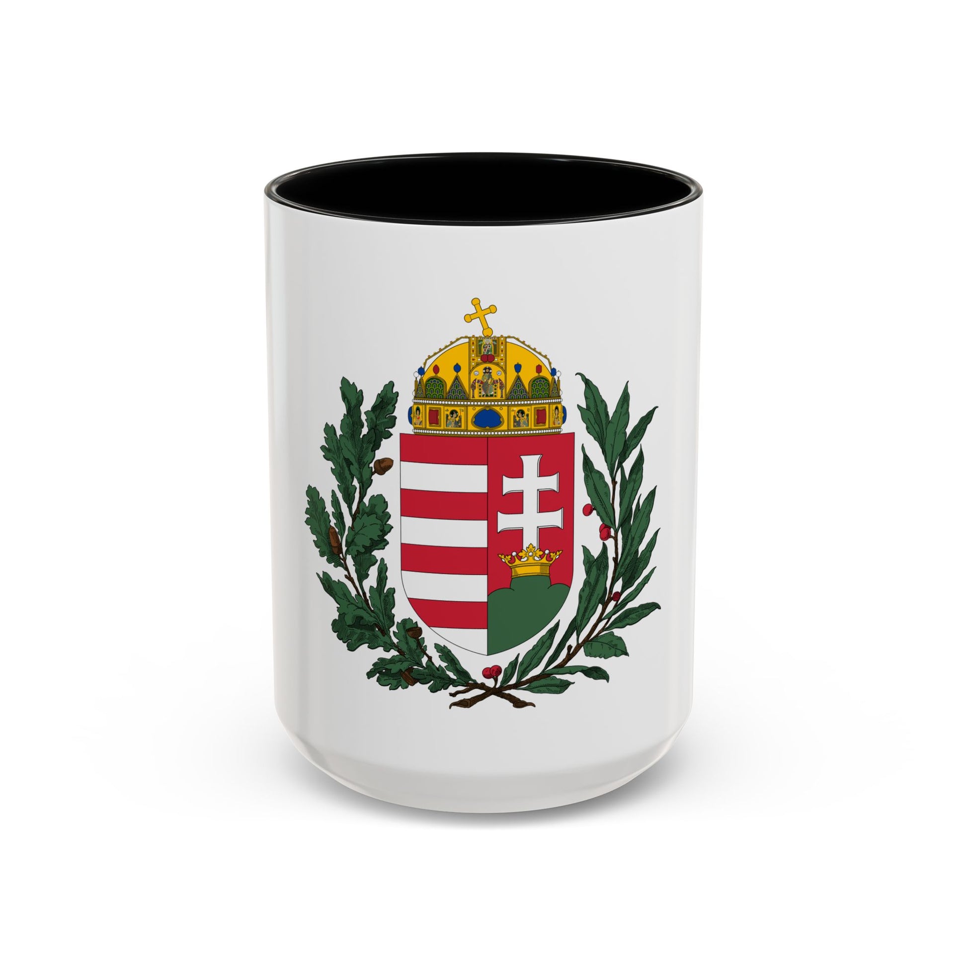 This Accent Coffee Mug features the Coat of Arms of Hungary from the years 1896-1915. The design showcases a rich history and symbolism representative of the nation. At the center, Saint Stephen, the first King of Hungary, is depicted holding a Holy Crown and an orb. Surrounding him are various emblems, including a holy crown, a shield with three crossing chains, and an eagle holding a staff topped by a cross. The intricate details of this historic heraldry make this mug a perfect conversation starter for those who appreciate unique and cool drinkware, as well as history enthusiasts and Hungarian culture admirers.