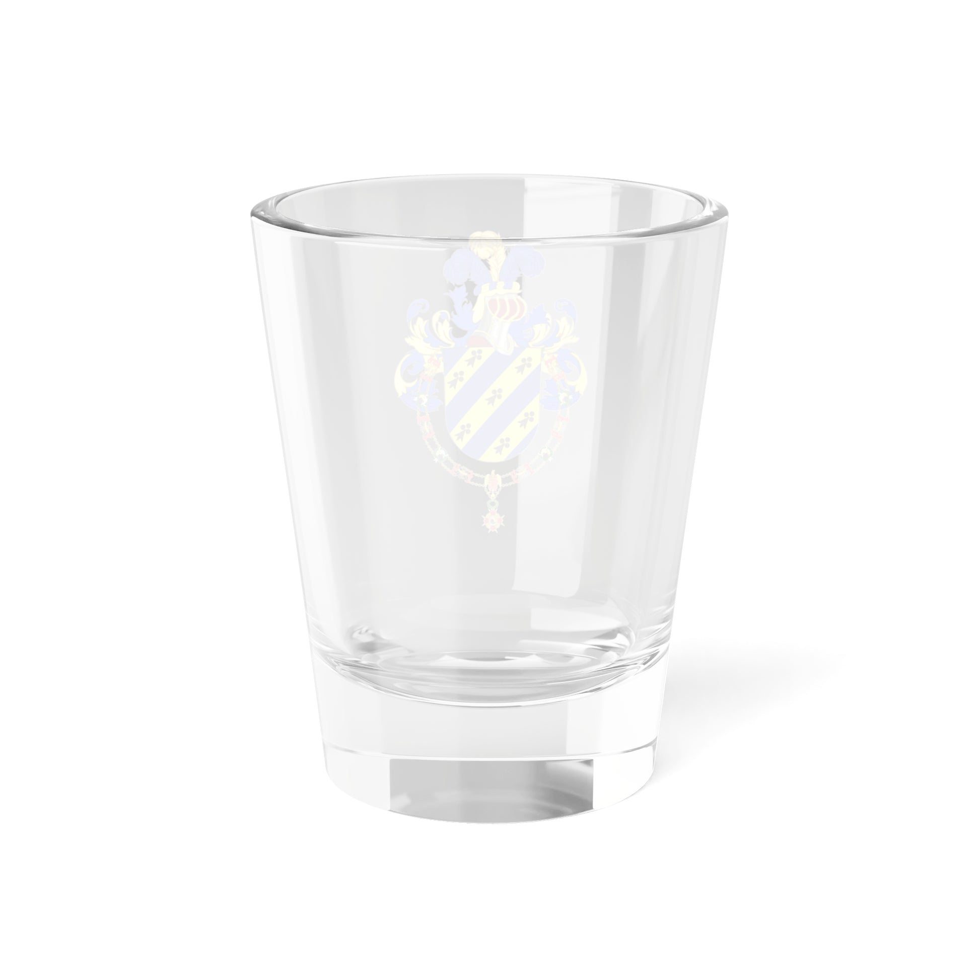 This shot glass showcases a distinguished heraldic design, specifically the Coat of Arms awarded to Iván Duque Márquez, former President of Colombia, upon receiving the Collar of the Order of Isabella the Catholic from Spain in 2021.