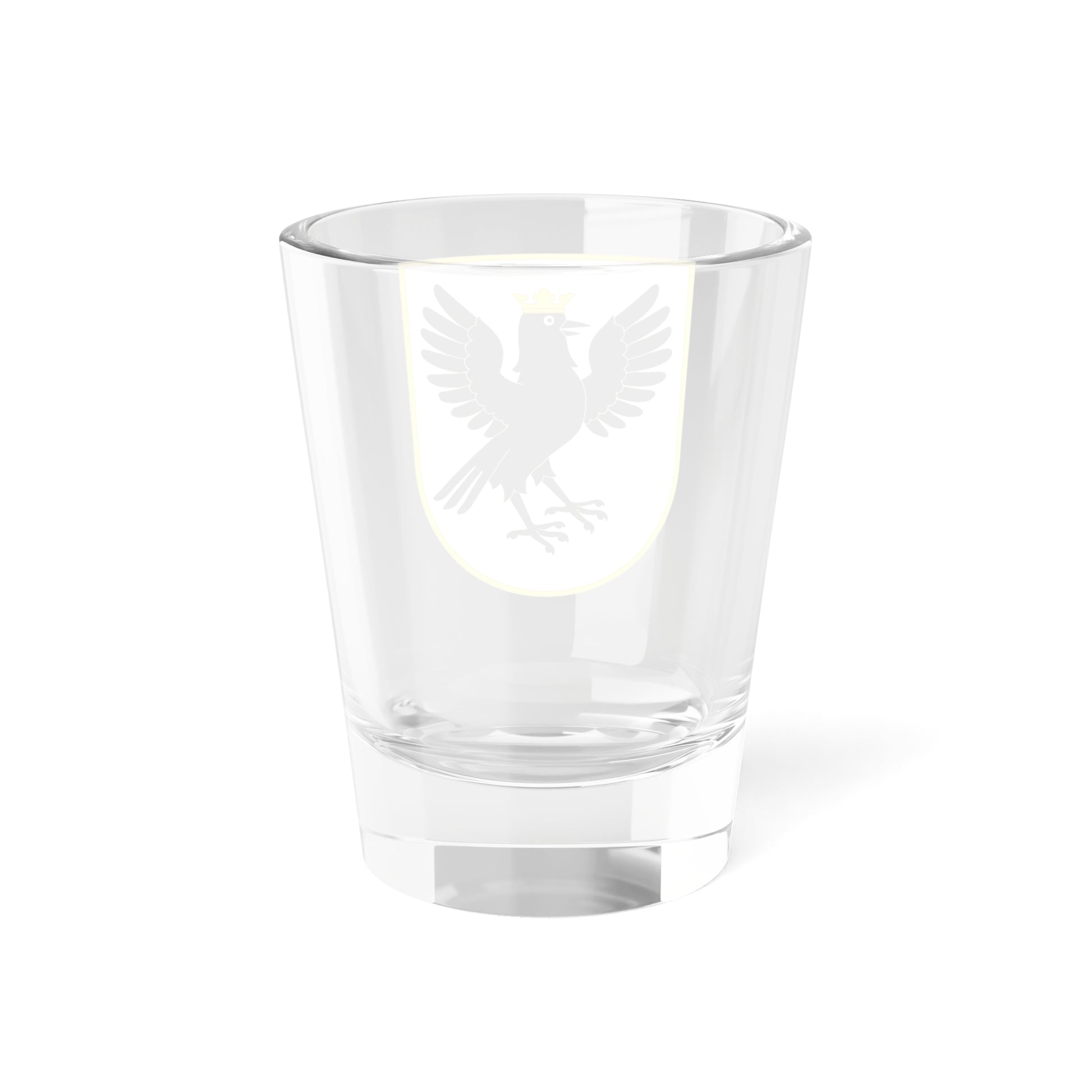 This shot glass proudly displays the Coat of Arms of Ivano-Frankivsk Oblast, a striking heraldic emblem of the western Ukrainian region.