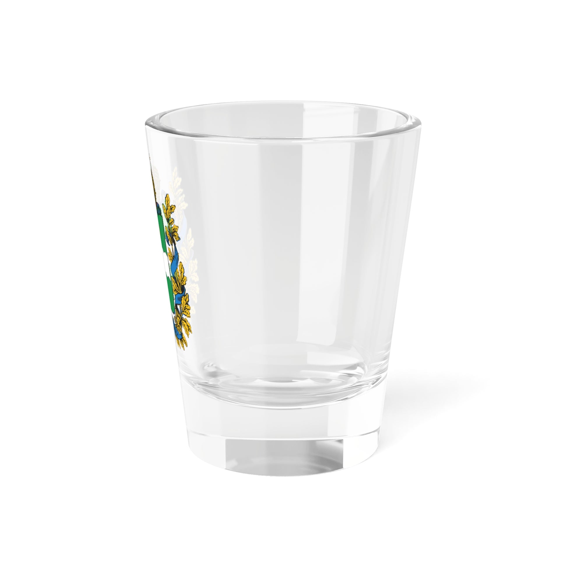Hey there! This shot glass is a real historical beauty. It features the coat of arms of Kaluga Governorate, which was the official emblem of this Russian province from 1796 to 1929. The design dates back to 1859, when they decided to spruce up the heraldry scene. The shield is a calming blue, and in the center, you'll find a wavy silver band, representing the Oka River that flows through Kaluga. On either side, two golden lions are holding things down. It's like a royal family portrait with a touch of river vibes!