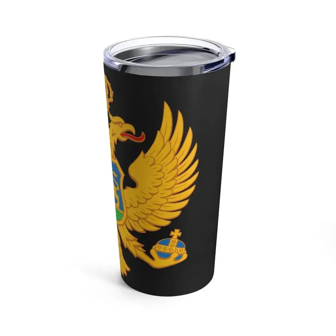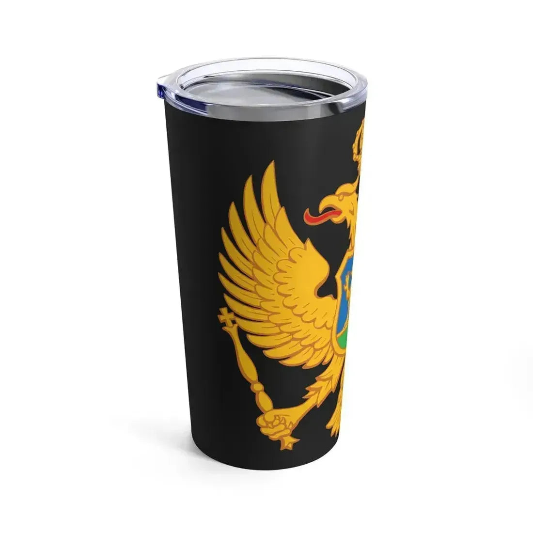The Coat of Arms of Montenegro is a historic symbol that represents the nation's heritage and identity. This iconic emblem has been officially used since 2004 and embodies a rich history dating back to the Middle Ages. The design features a shield divided into three parts: the left side bears three black mountain peaks on a golden field, symbolizing Montenegro's rugged terrain; the right side displays a golden lion passant guardant on a red field, representing the country's historic connections to the Nemanjić dynasty; and the center showcases a silver two-headed eagle, symbolizing the dual sovereignty of the Montenegrin principality over Zeta and Rascia. This 20oz tumbler serves as an elegant tribute to Montenegro's proud heritage, making it perfect for anyone who appreciates unique and cool drinkware.