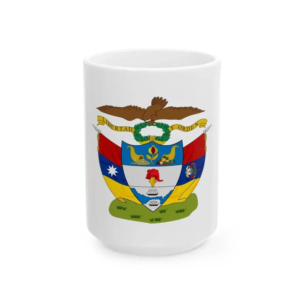 This White Coffee Mug showcases the Coat of Arms of New Granada, a historical emblem that represents Colombia before its full independence in 1831. The design features a shield divided into four quarters, symbolizing the four original provinces: Cundinamarca, Antioquia, Santander, and Quito (Ecuador at the time). Each quarter has distinct symbols representing the region's resources and character. The shield is topped by an andean condor, a bird of great significance in Andean cultures, signifying freedom and power. The motto "Dios, Unión y Libertad" (God, Union and Liberty) encircles the shield. This mug makes for an excellent conversation starter and is perfect for anyone who appreciates unique and cool drinkware, as well as history enthusiasts with a soft spot for Colombia.
