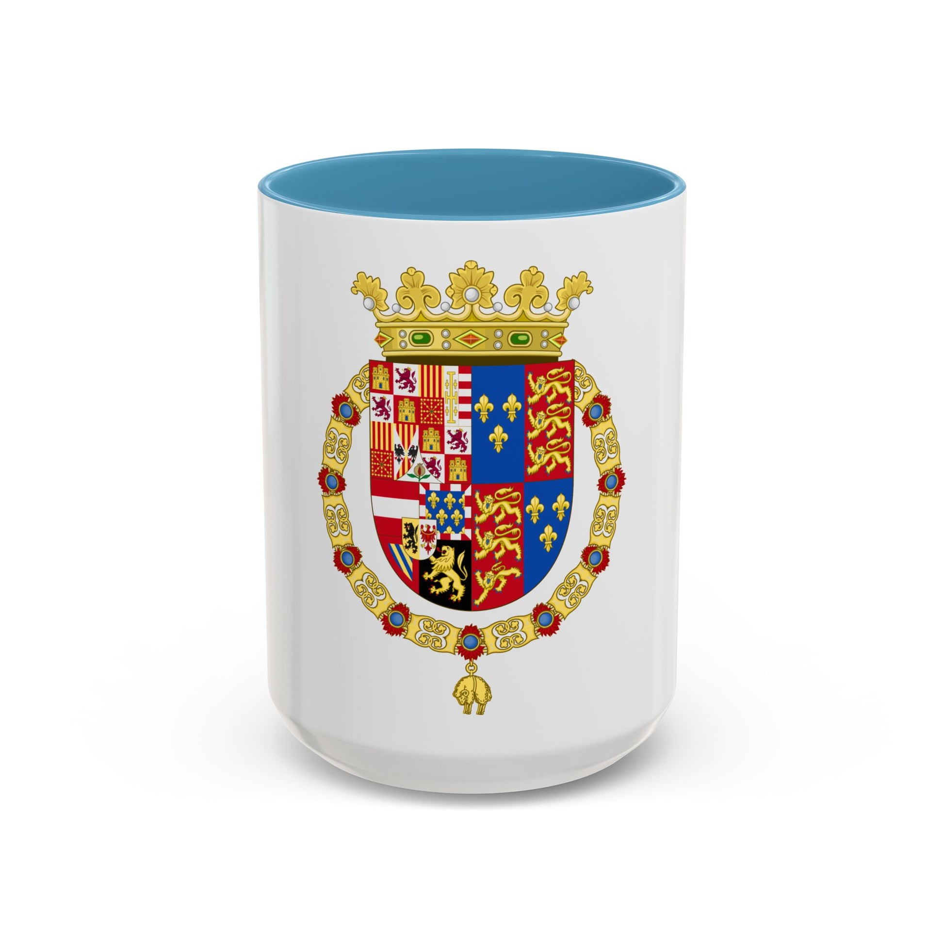 The coat of arms is a testament to the historical significance of Philip II's reign, a time marked by religious tension and geopolitical upheaval in Europe. This coffee mug serves as an intriguing conversation starter for history enthusiasts, art collectors, or anyone who appreciates unique and cool drinkware showcasing historical designs.