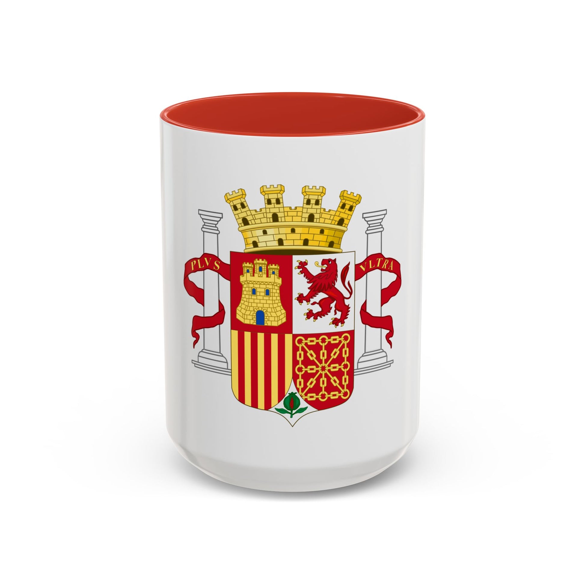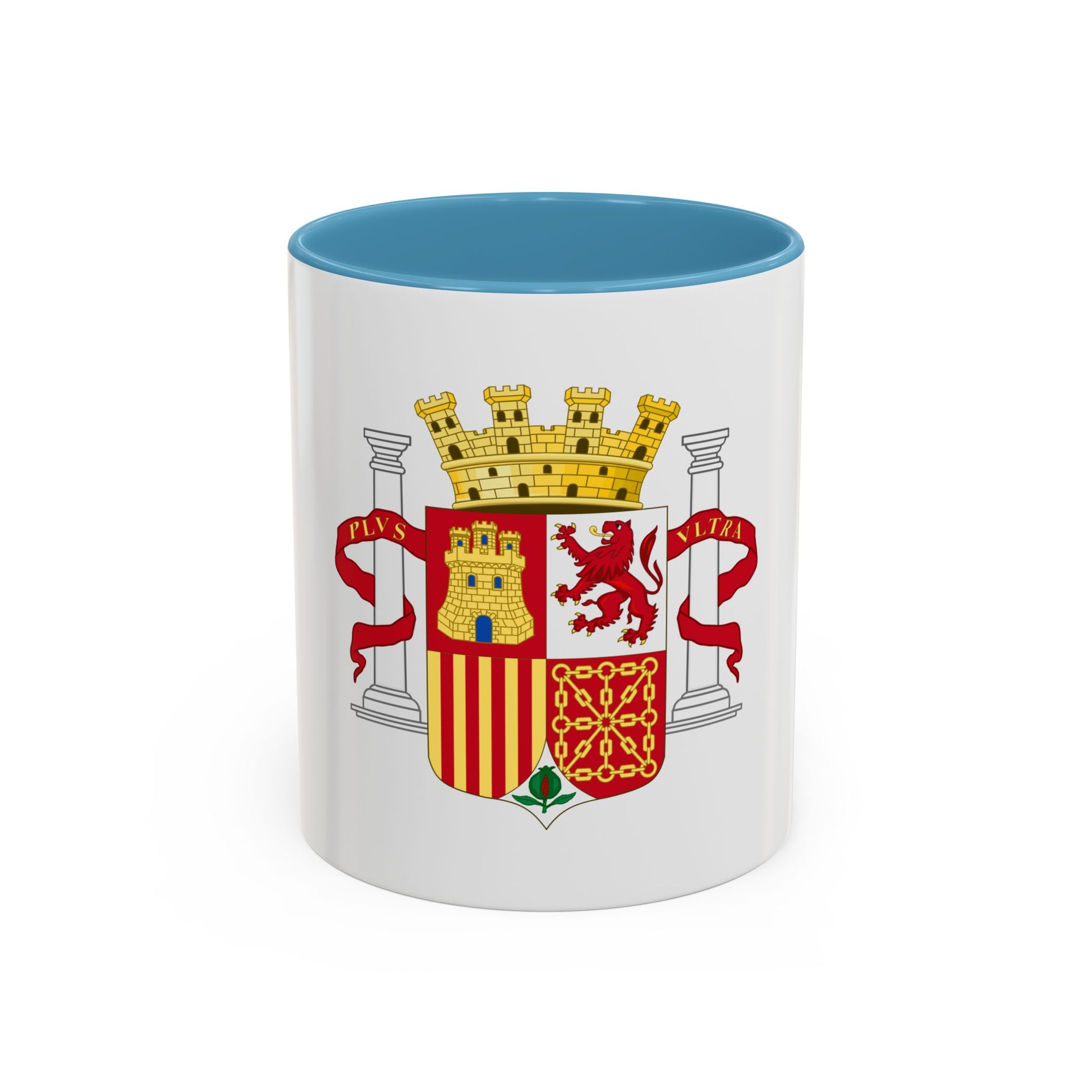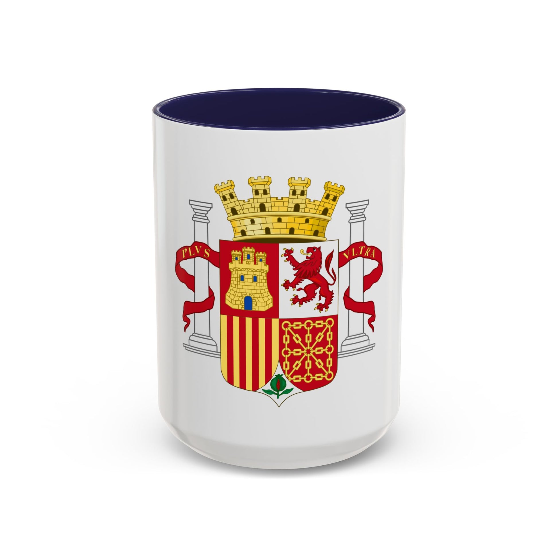 The Coat of Arms of Spain (1931-1939) adorns this accent coffee mug, offering a fascinating glimpse into the country's historical emblem during the Second Spanish Republic. This coat of arms, designed by Josep Obiols i Mores, is characterized by its vibrant colors and intricate details, symbolizing unity and sovereignty. The shield displays Spain's national motto, "Plus Ultra," emphasizing Spain's pioneering spirit and historical explorations beyond the known world. This unique coffee mug is perfect for anyone who appreciates unique and cool drinkware, as well as those with a keen interest in Spanish history and symbolism.