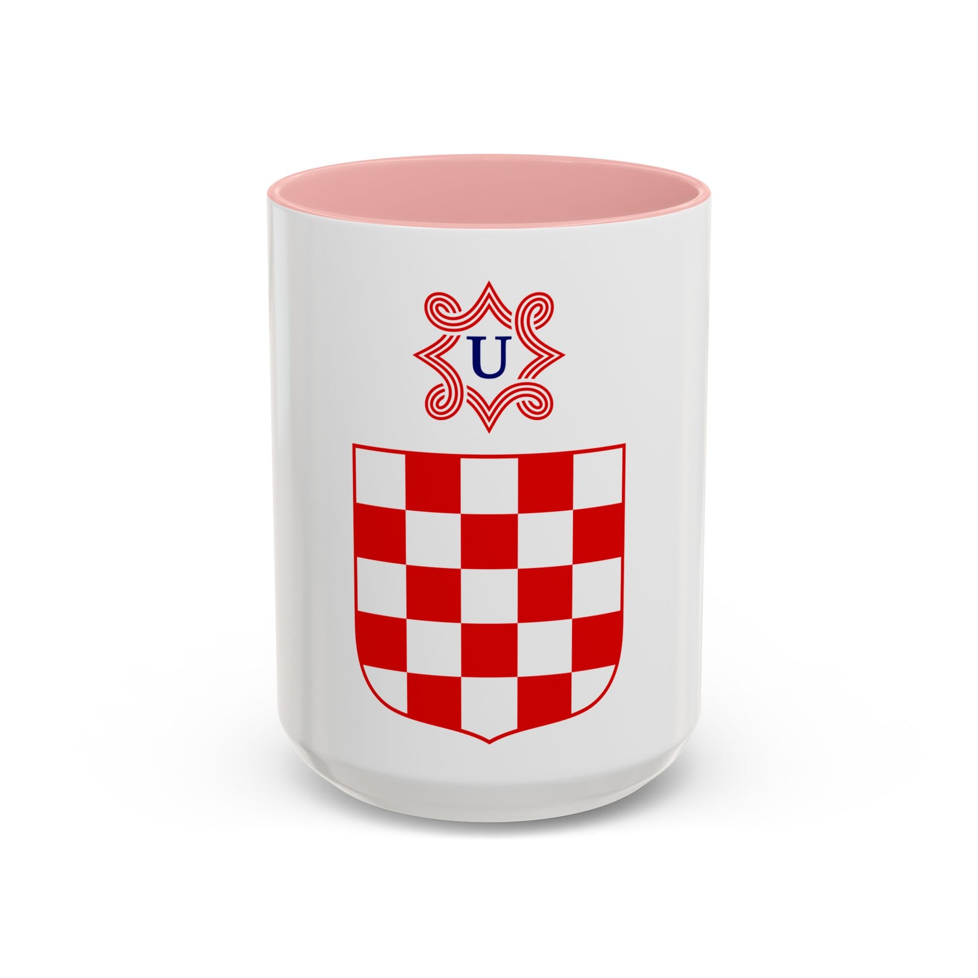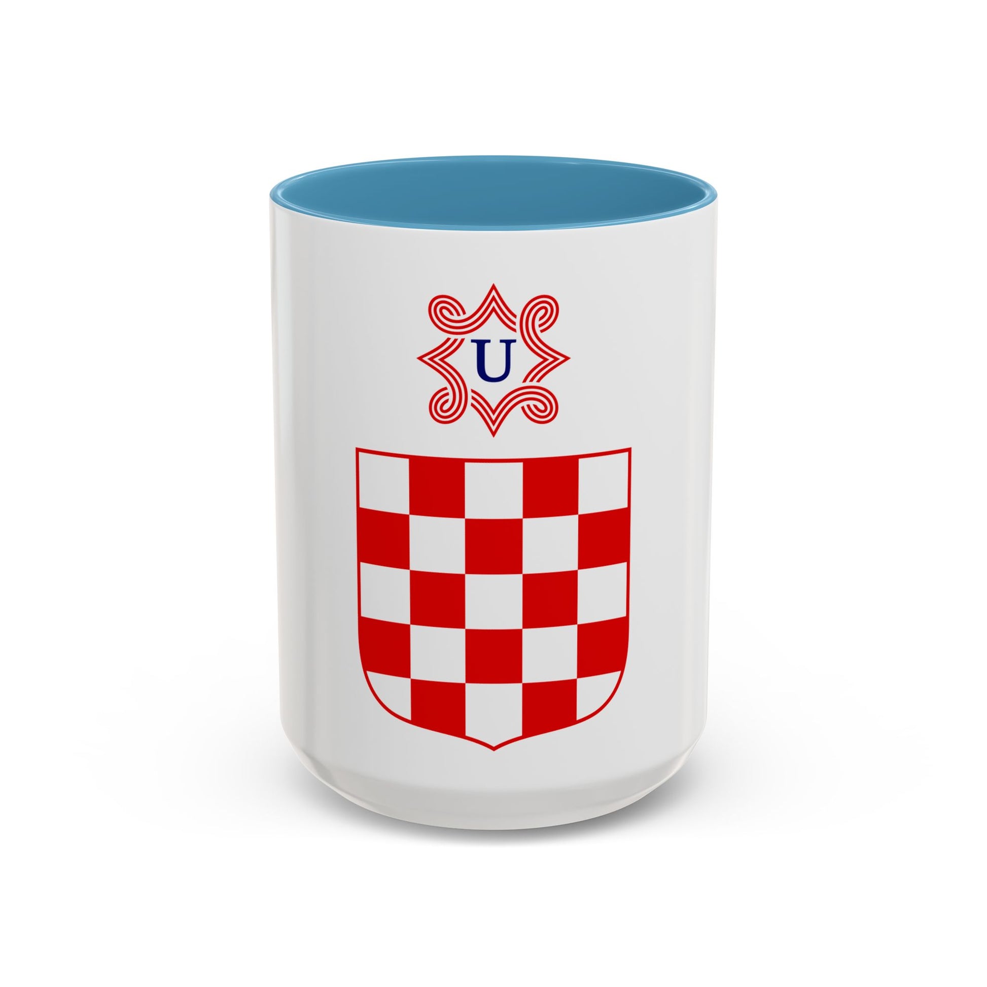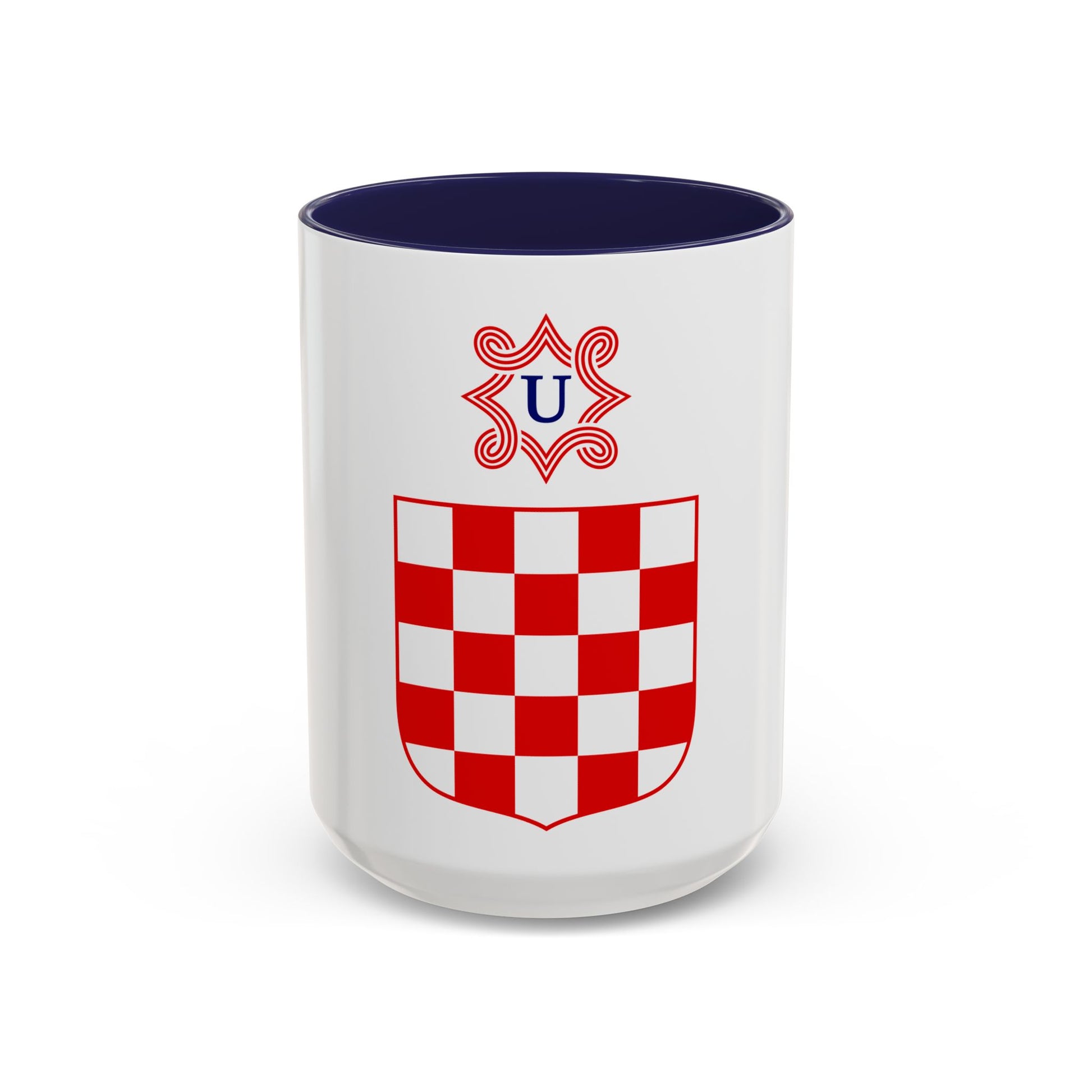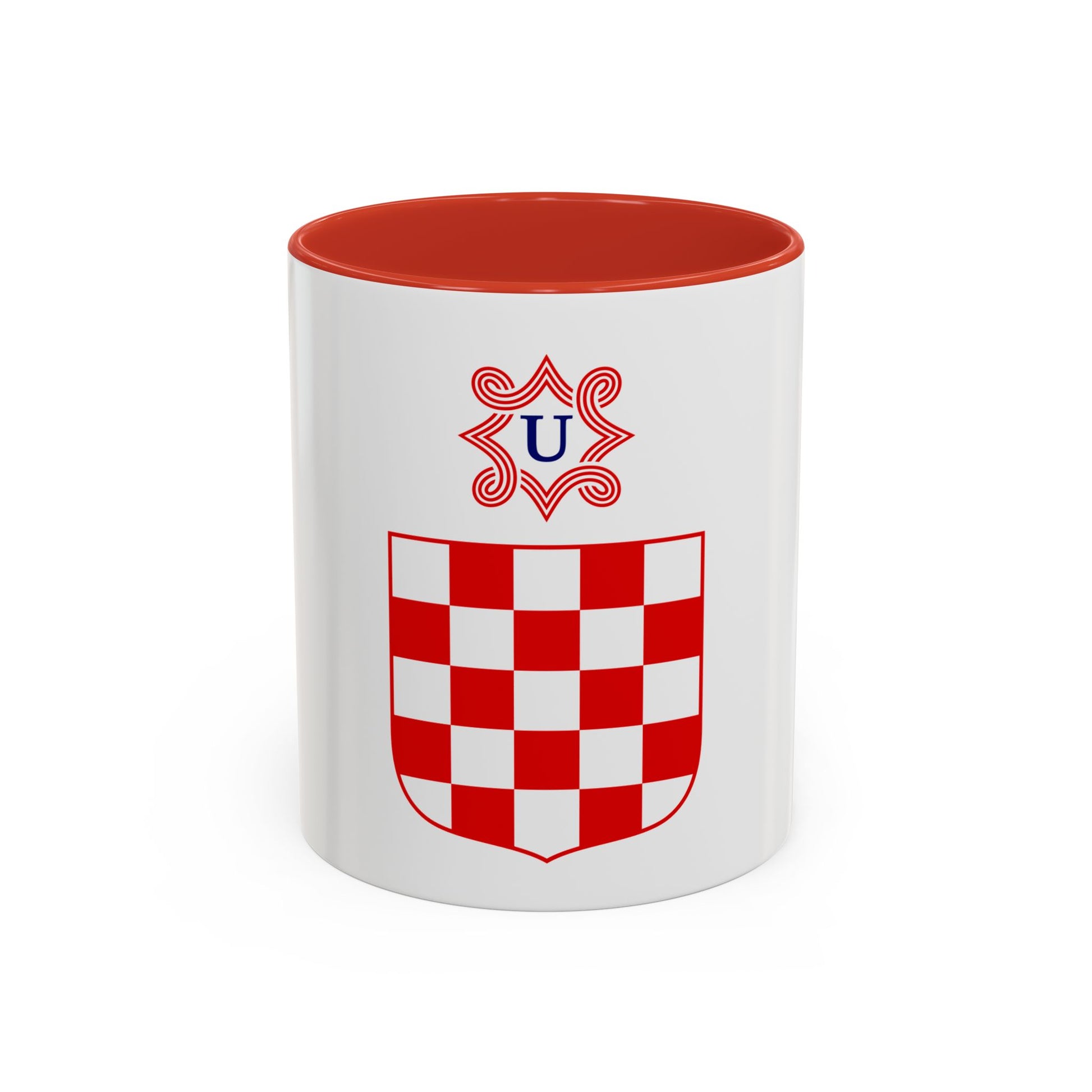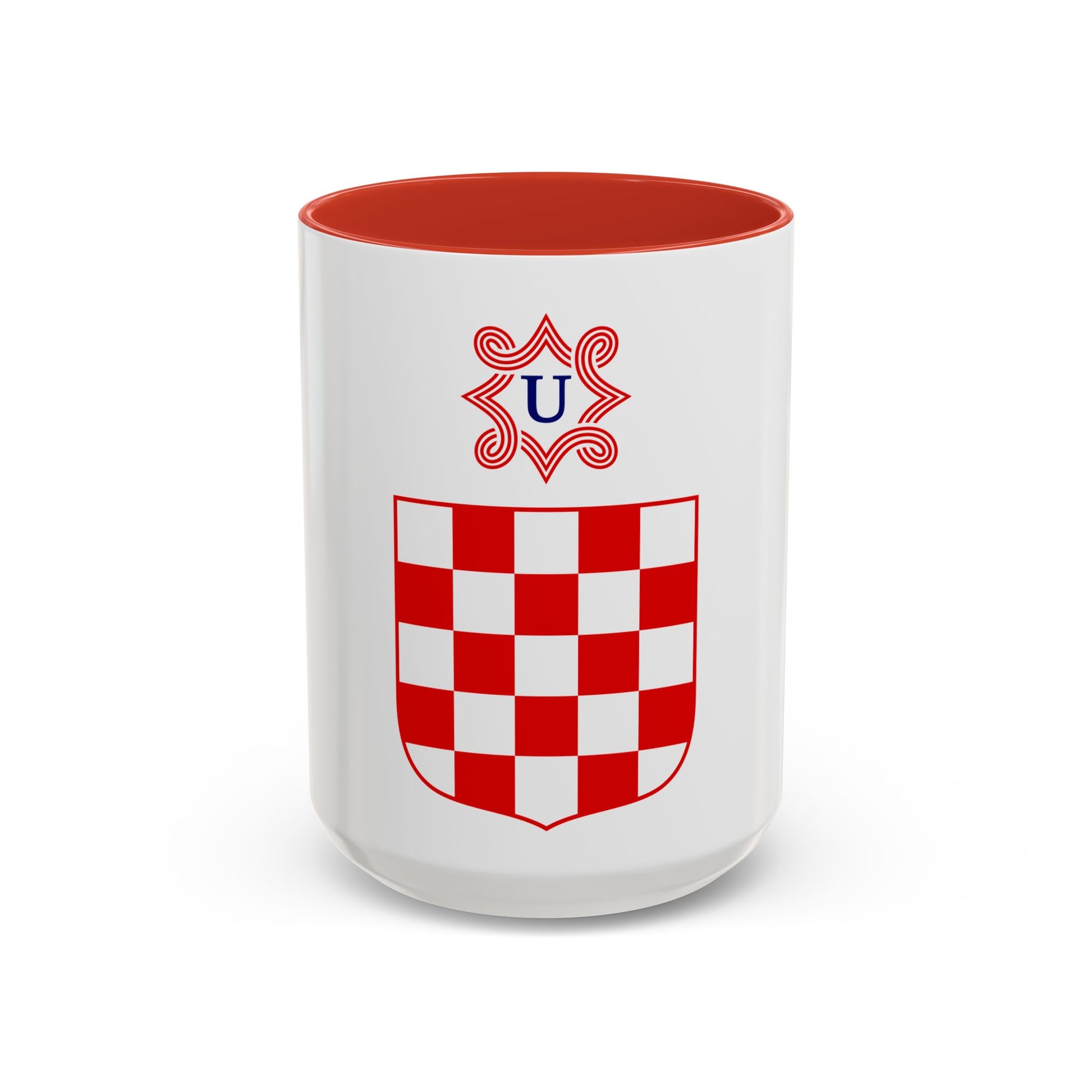 This Accent Coffee Mug showcases an intriguing design inspired by the Coat of Arms of the Independent State of Croatia. The historic coat of arms, a rich blend of symbols, emblems, and colors, is vividly depicted on this mug. It serves as a conversation starter for anyone interested in Croatian history or heraldry. This unique coffee mug is perfect for those who appreciate the unique charm of artwork that carries historical significance.
