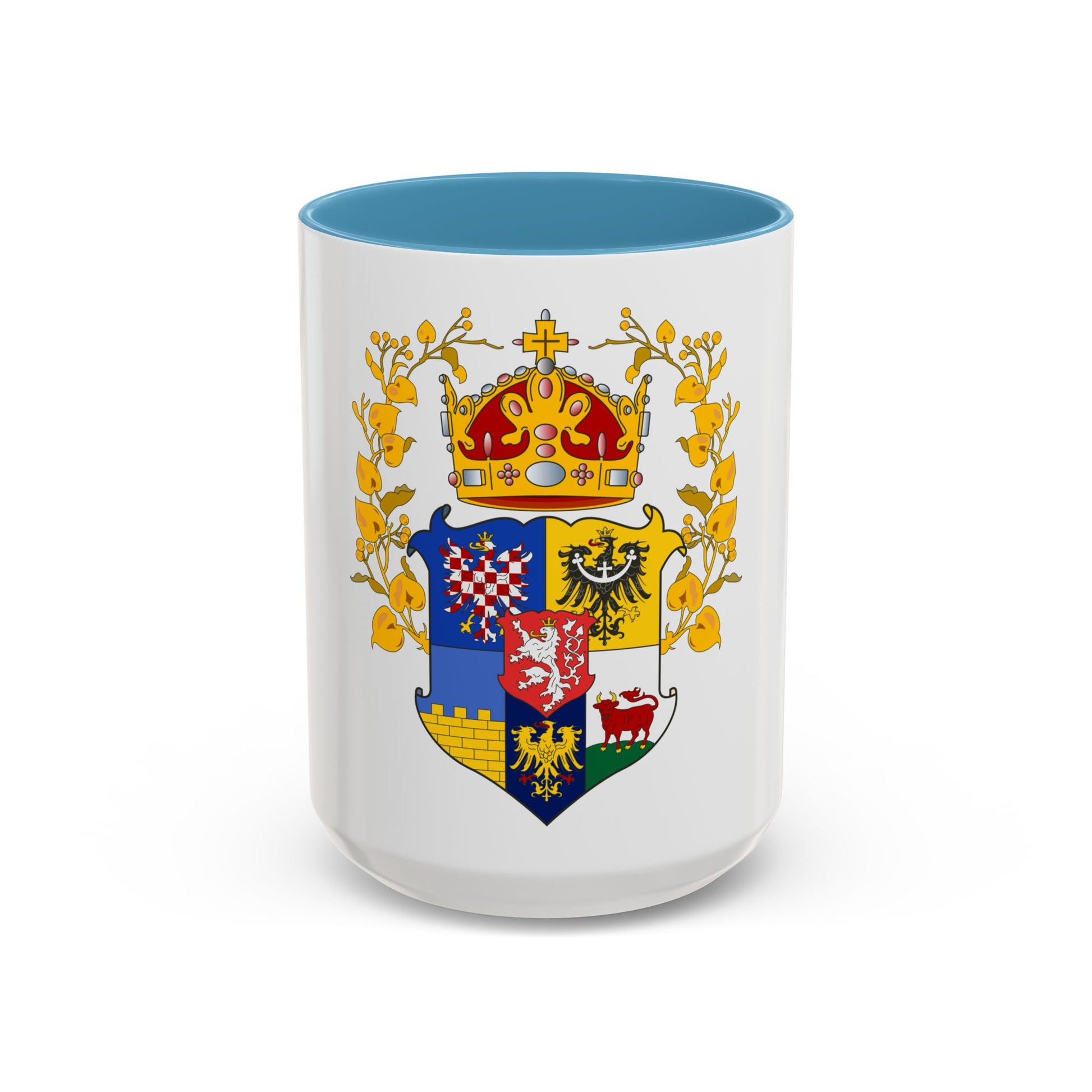 Step back in time with our "Coat of Arms of the Lands of the Bohemian Crown" Accent Coffee Mug. This mug showcases a historical design that pays homage to the rich heritage of the Bohemian Crown, a region that was once part of the Kingdom of Bohemia, now modern-day Czech Republic. The coat of arms represents the unity and power of the land, featuring symbols significant to its rulers and people. This unique coffee mug is perfect for anyone who appreciates unique and cool drinkware, as well as history enthusiasts who want a piece of the past in their daily routine.