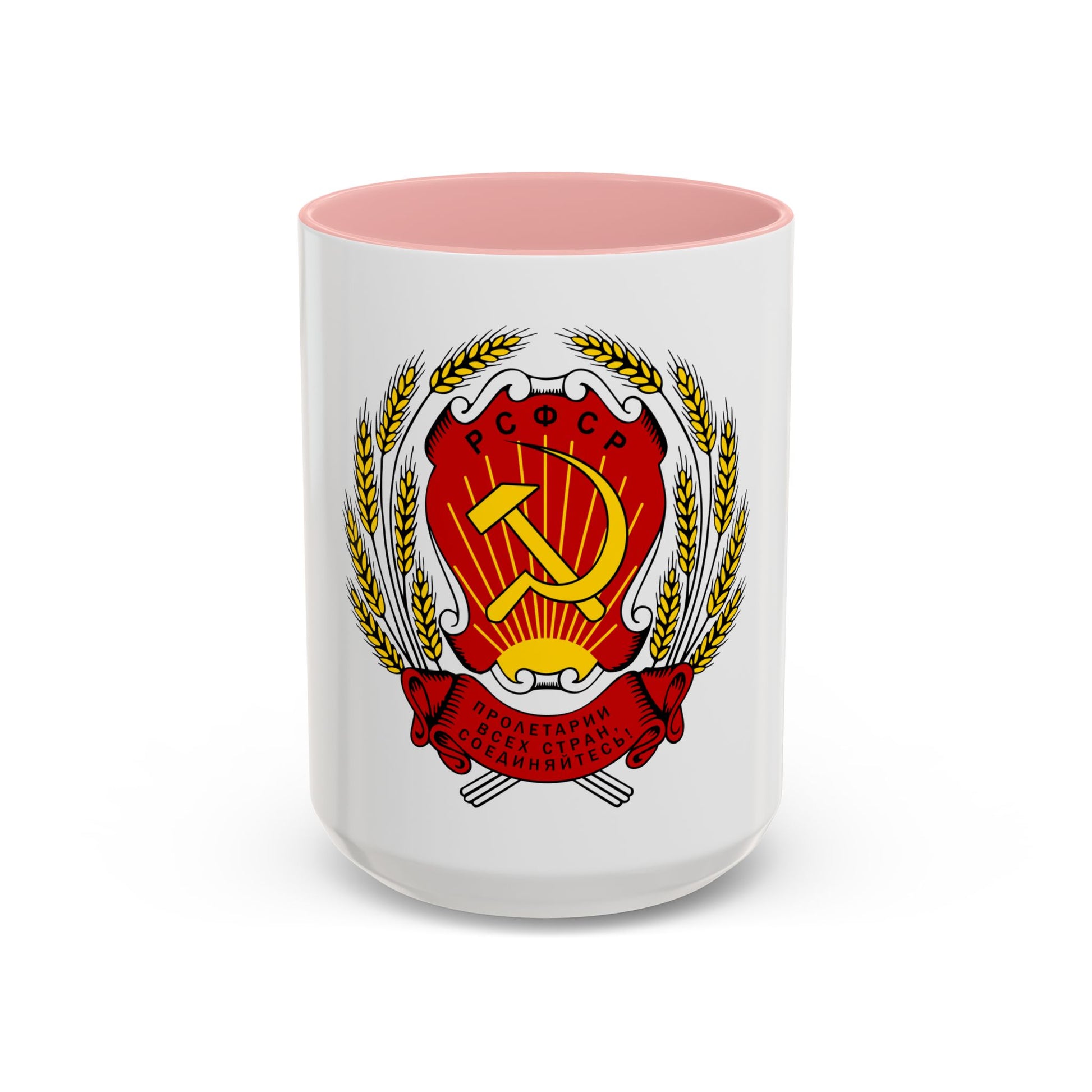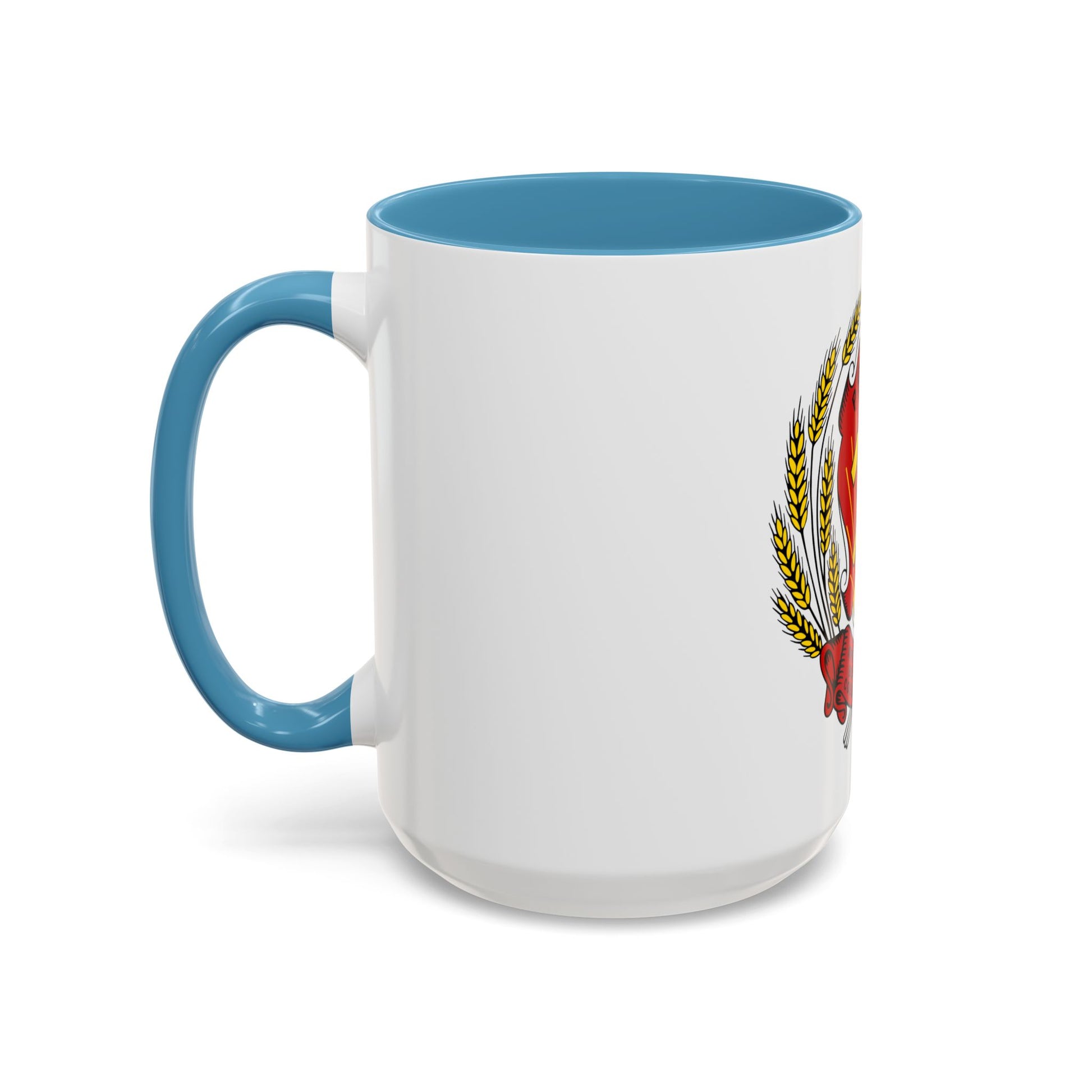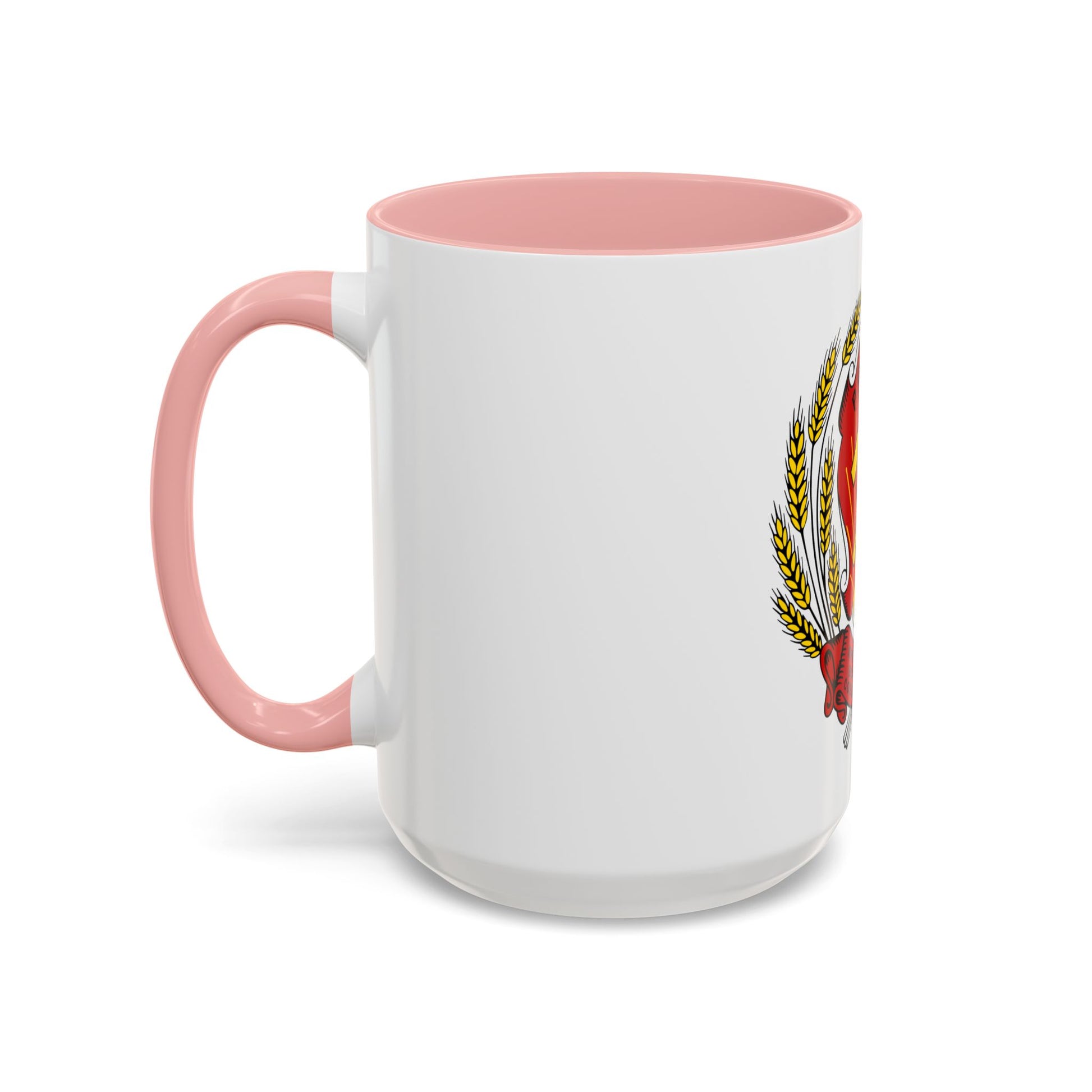 The "Coat of Arms of the Russian Soviet Federative Socialistic Republic (1954-1978)" accent coffee mug pays homage to a significant period in Russian history. This design features the official emblem of the Soviet Union during this time, which symbolizes the unity and strength of the nation. The design includes a golden five-pointed star atop a hammer and sickle, with the Soviet Union's name (ВСЕСОЮЗ) inscribed around the perimeter. A wheat stalk and a rising sun are also included, signifying the country's agricultural and industrial might.