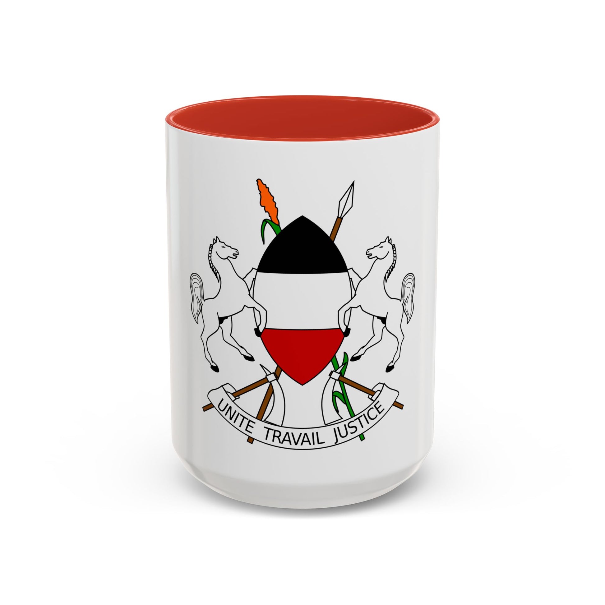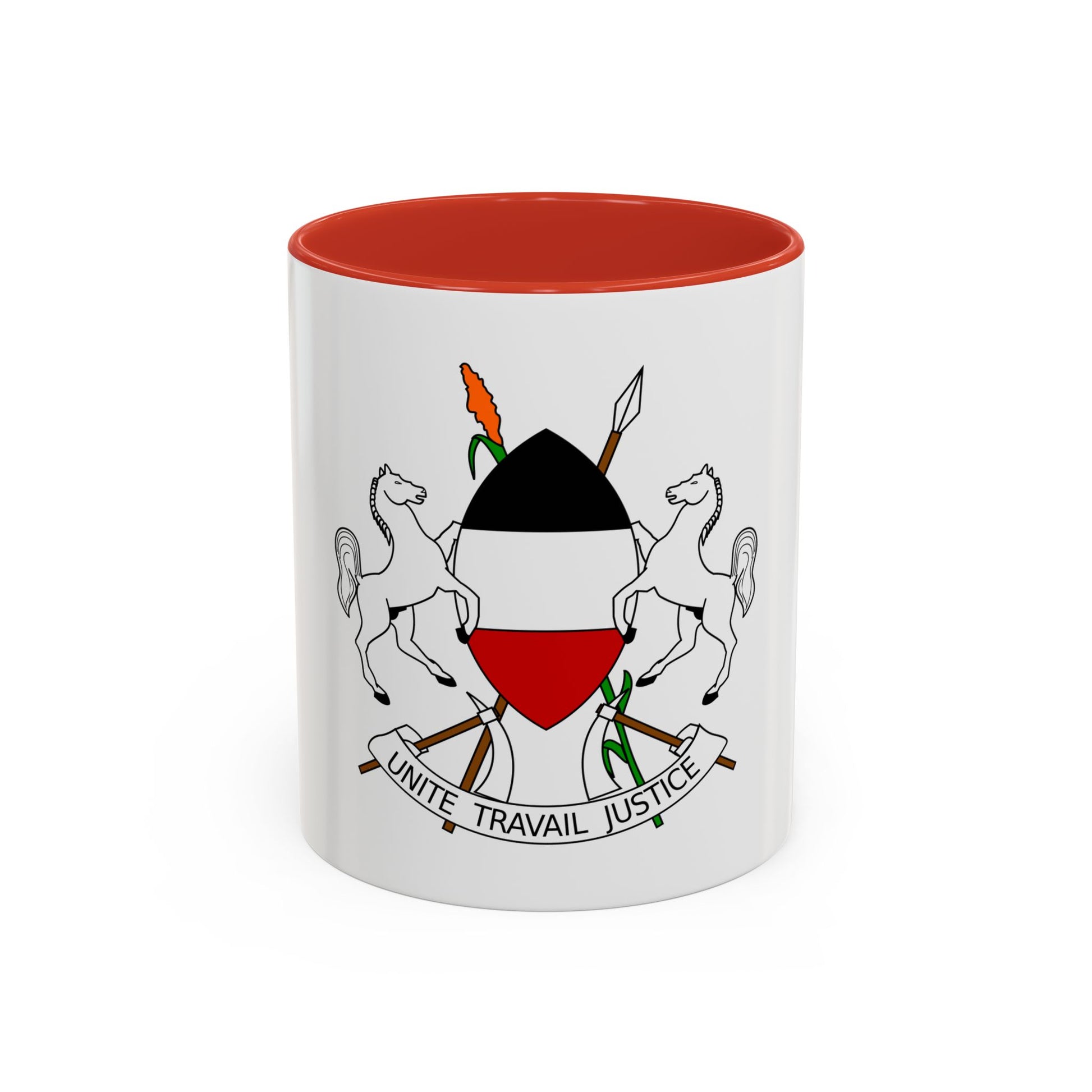 Step back in time with our Accent Coffee Mug featuring the Coat of Arms of Upper Volta (1967-1984). This historic design showcases the heraldry of this African country during its brief existence before it was renamed Burkina Faso. The artwork on this mug includes a shield divided into four quadrants, each representing a different aspect of the nation's identity. The top left quadrant features a palm tree, symbolizing Upper Volta's tropical climate and agricultural potential. The bottom right quadrant showcases a sheaf of corn, signifying the country's primary staple food. This unique mug is perfect for anyone who appreciates unique and cool drinkware, as well as history buffs or collectors with an affinity for African art and culture.