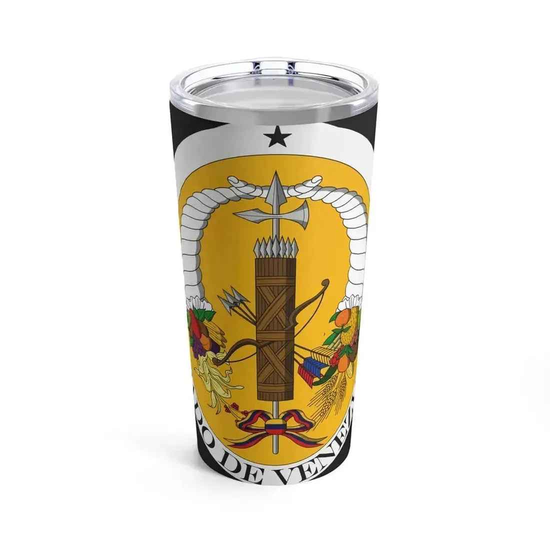 This 20oz tumbler showcases the Coat of Arms of Venezuela from the period between 1830 to 1836. The design is a testament to the rich history and heritage of this South American nation. The escutcheon, or shield, presents a vibrant landscape, symbolizing Venezuela's diverse geography, with rolling mountains, a plentiful river, and a lush coastal region. The five yellow stars scattered across the blue field represent the five provinces that united to form Venezuela. The banner beneath reads "For Free Homeland," reflecting the spirit of independence and freedom that remains integral to Venezuelan identity. This tumbler is perfect for anyone who appreciates unique and cool drinkware, especially history buffs and admirers of Latin American culture.