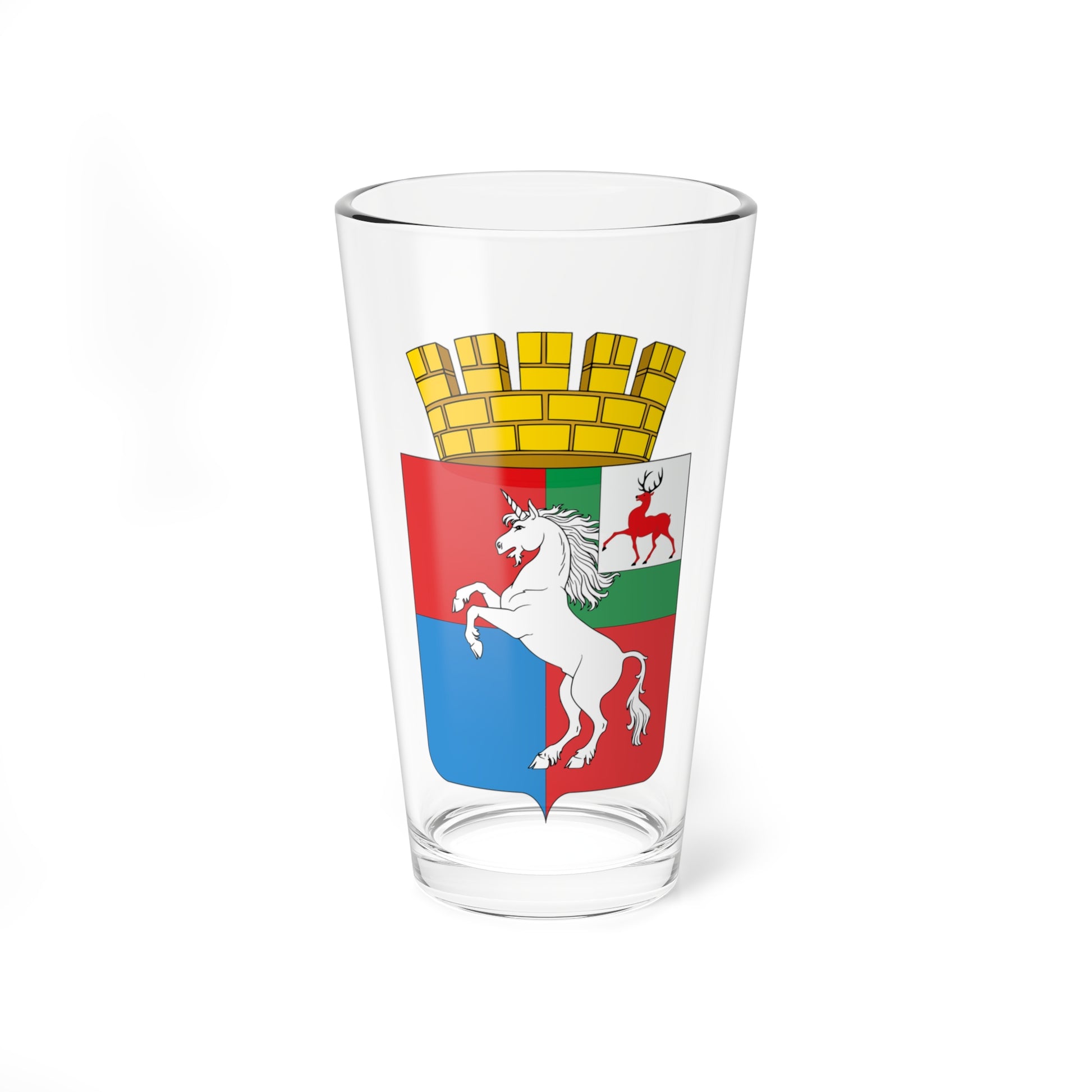 This pint glass showcases the heraldic artistry of the Coat of Arms of Vyksa, a city within Nizhny Novgorod Oblast, Russia, specifically the version "with canton and crown." The design is meticulously crafted, featuring a visually striking and symbolic representation of the city's identity.