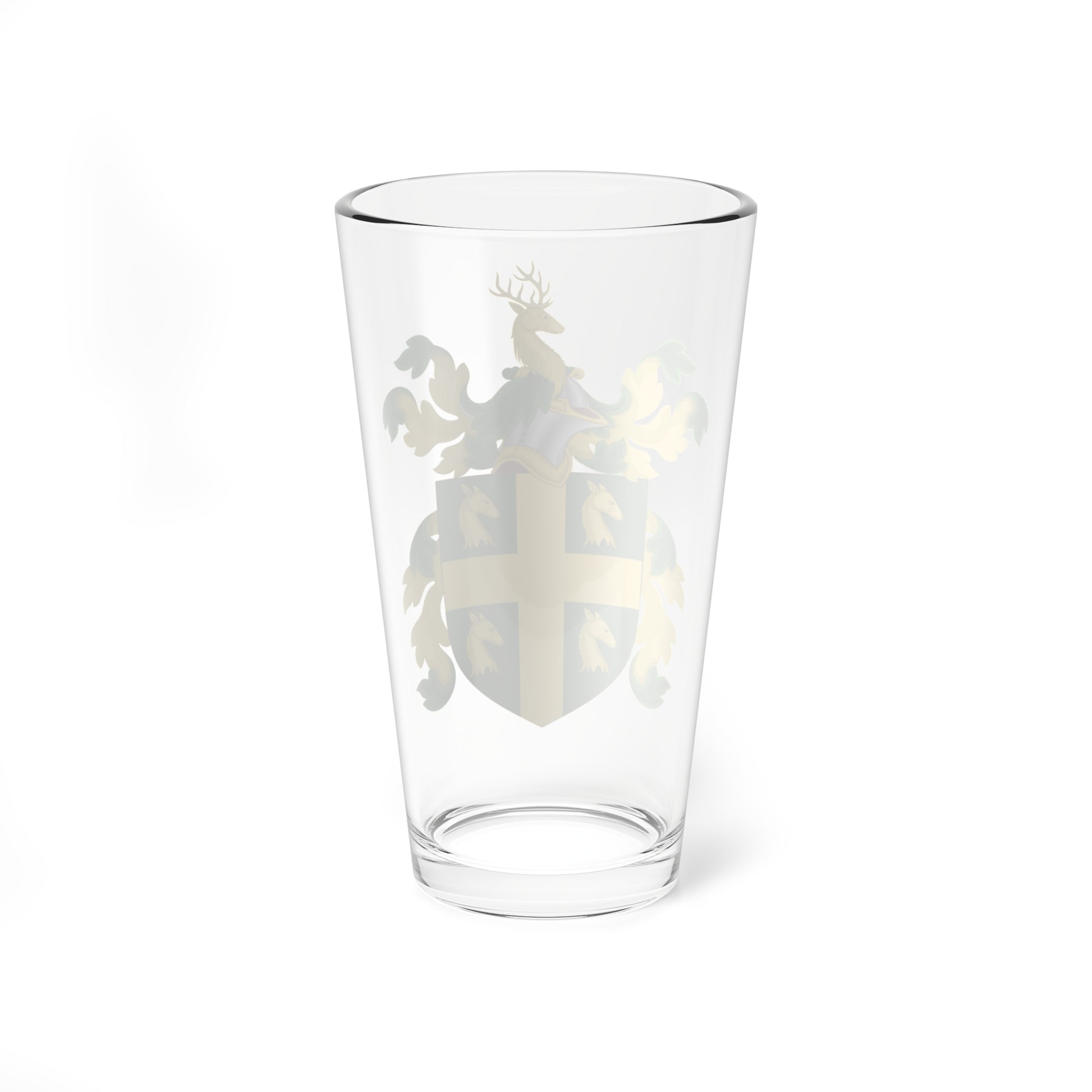 This pint glass features a striking rendition of the coat of arms attributed to Walter Dickenson. The design is a vibrant display of heraldic artistry, designed to be both visually compelling and historically resonant.