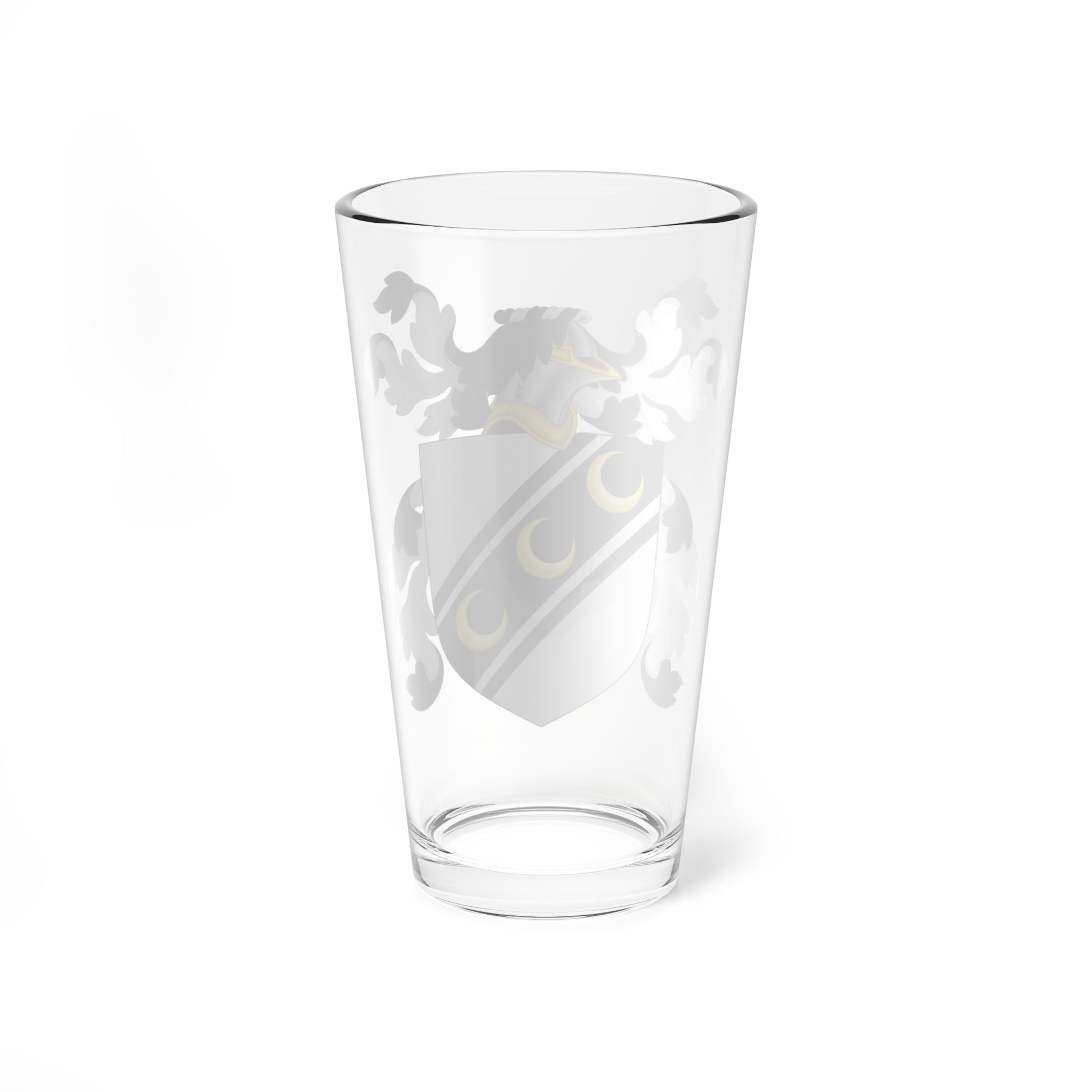 This pint glass showcases the heraldic design attributed to William Dyer, a notable early settler of Rhode Island. The artwork centers around a striking coat of arms, meticulously rendered for visual impact.