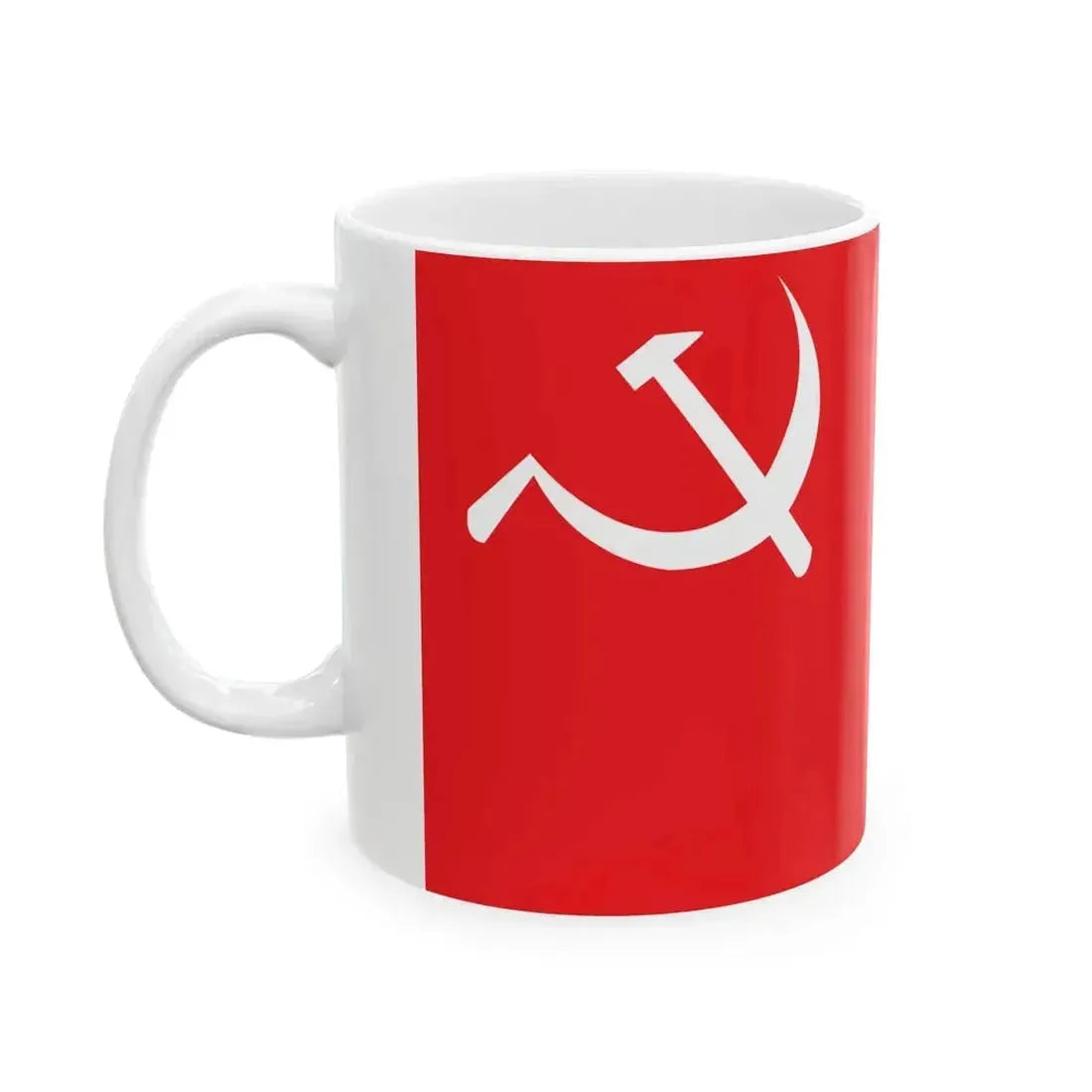 The design on this white coffee mug features the official flag of the Communist Party of Bhutan. The flag, adopted in 2007, consists of a red background with a golden rising sun over two crossed hammers and a sickle. This graphic embodies the party's commitment to unity, progress, and socialist ideology. The mug serves as an attractive and educational artifact for anyone who appreciates unique and cool drinkware.