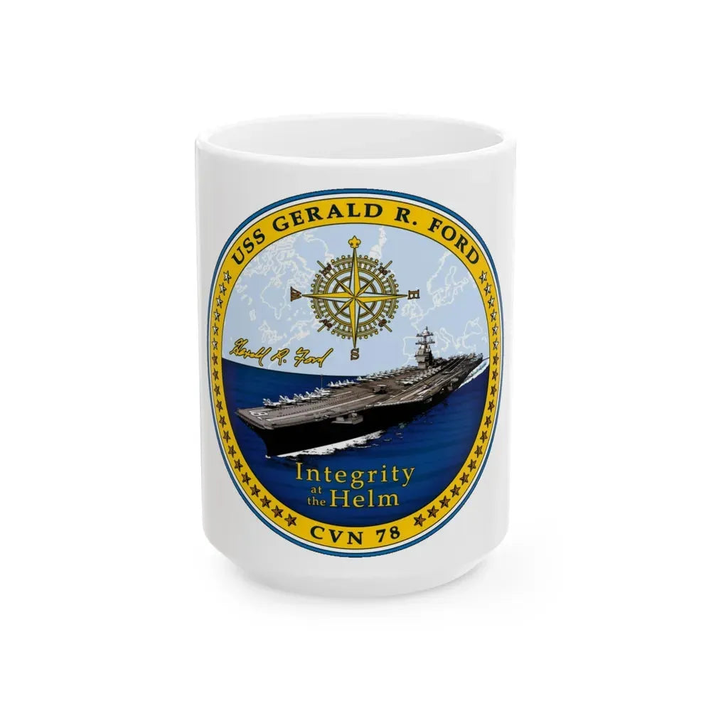 This white coffee mug showcases an intricate design inspired by the USS Gerald R Ford (CVN 78), a United States Navy aircraft carrier commissioned in 2017. The design artfully captures the spirit of this state-of-the-art naval vessel, symbolizing its significance and innovation. The graphic depicts the USS Gerald R Ford with precision, making it an ideal choice for those who take pride in American maritime history or the U.S. Navy. Its elegant simplicity also appeals to collectors seeking unique and meaningful drinkware.