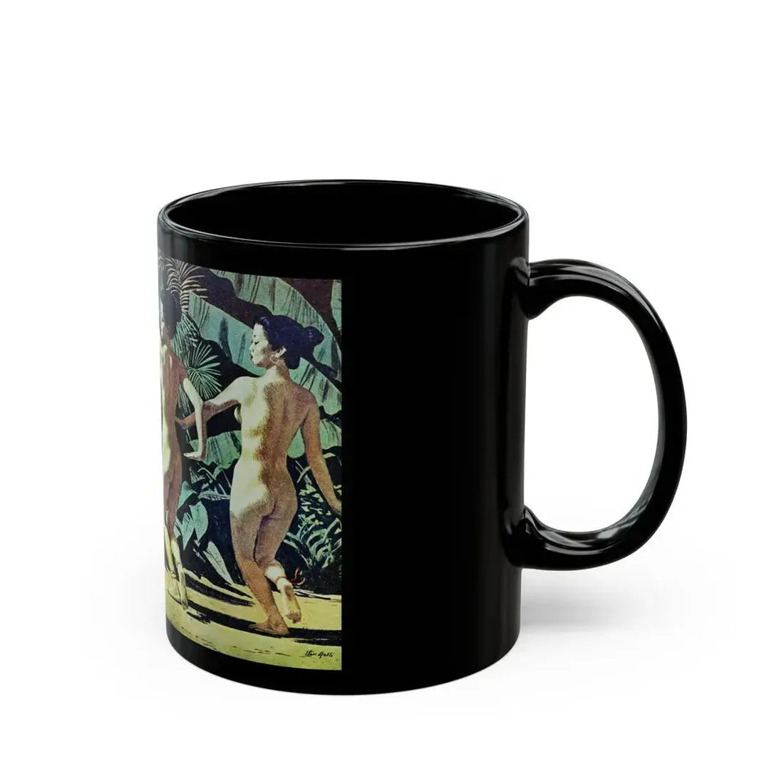 Step back in time to a captivating moment in the mid-20th century with this Black Coffee Mug featuring the intriguing artwork from Dancing Angels of Death, as it graced the cover of True magazine in September 1955. This striking design showcases a dramatic scene of ethereal dancers, personifying the concept of death in a mesmerizing and enigmatic manner. The imagery within this graphic is both alluring and thought-provoking, making it an excellent conversation starter for those who appreciate unique and thoughtful artistry.