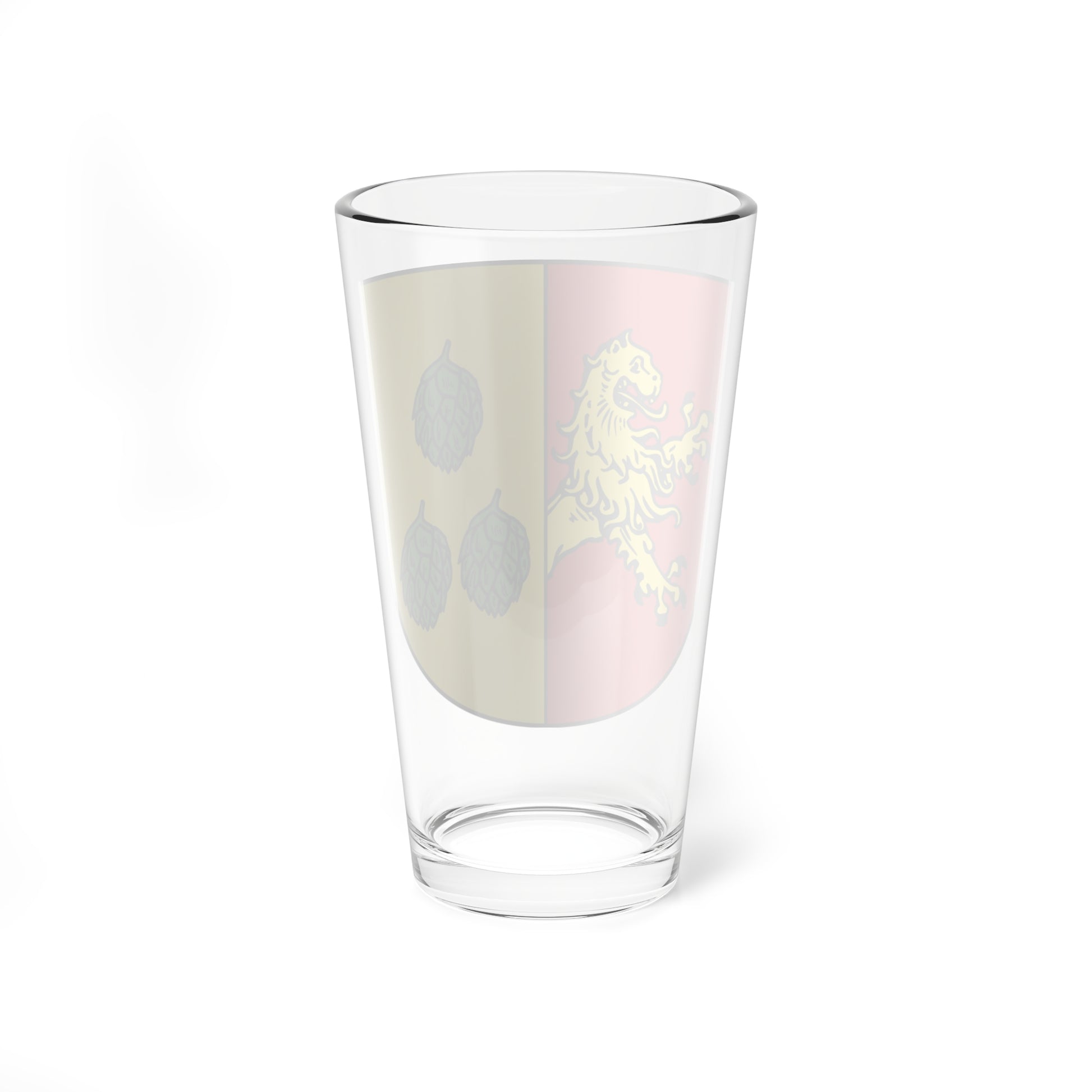 This pint glass showcases the official coat of arms of Calvörde, Germany, adopted in 1993. The design is a vibrant representation of the municipality's history, geography, and natural environment, encapsulated within a classic heraldic shield.
