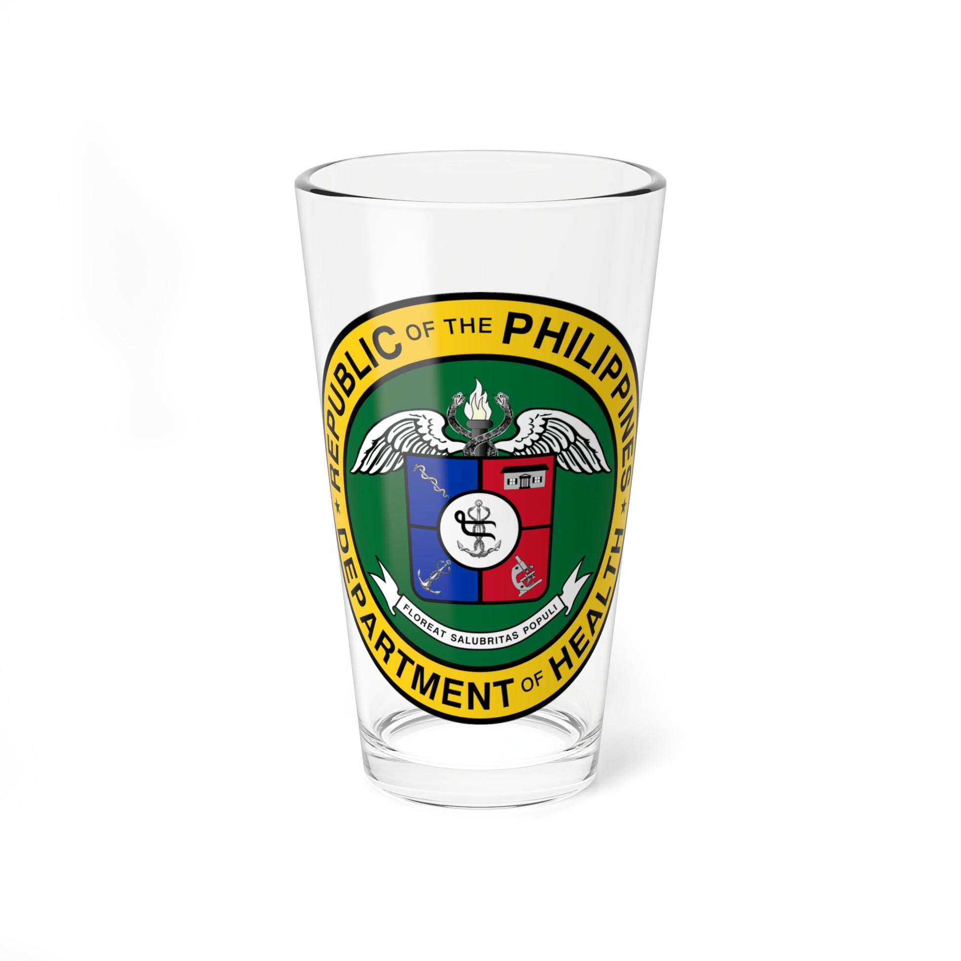 This pint glass showcases the official seal of the Department of Health (DOH) of the Philippines. The design is a circular emblem, rich with symbolic meaning.