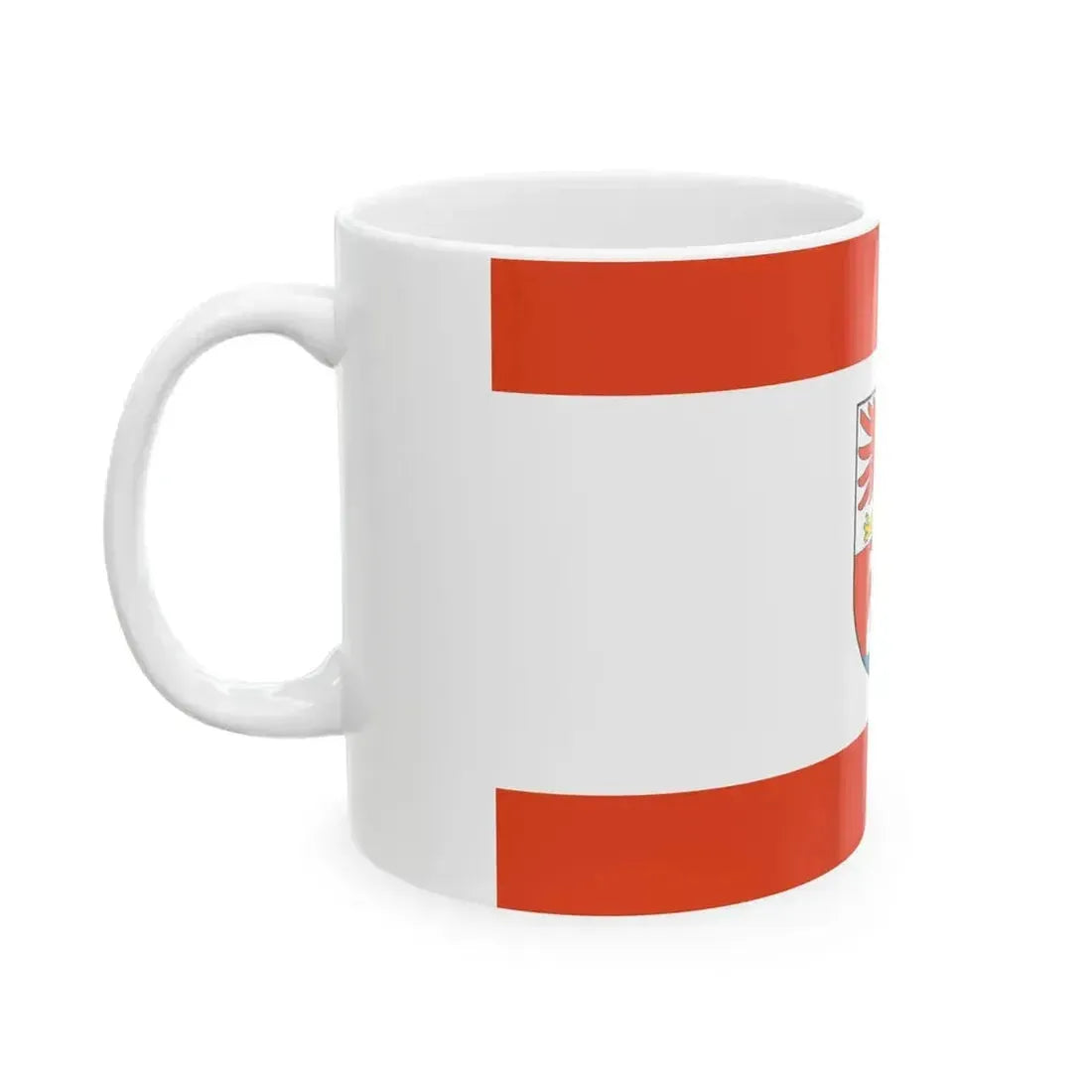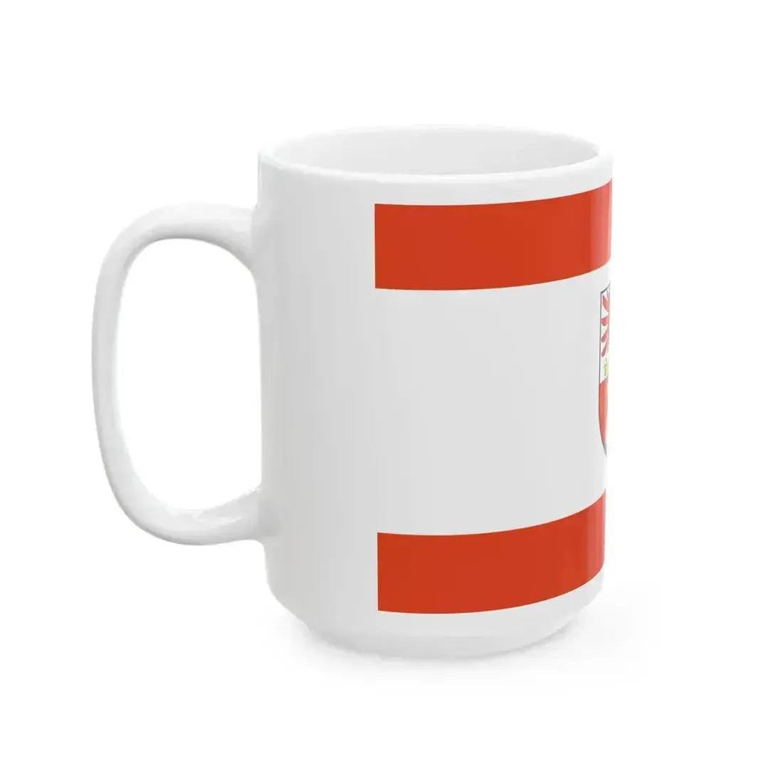 The DEU Prenzlau Flag (Germany) White Coffee Mug is a piece of tableware that showcases the flag of Prenzlau, a small town in the state of Mecklenburg-Vorpommern, Germany. This flag, designed in 1992, features three stripes in the colors of red, white, and blue, with a gold crown and four gold acorns scattered throughout. The design symbolizes Prenzlau's history as a ducal seat and its rich forestry resources. This coffee mug serves as an excellent conversation starter for anyone with interest in German regional heraldry or the culture of Mecklenburg-Vorpommern.