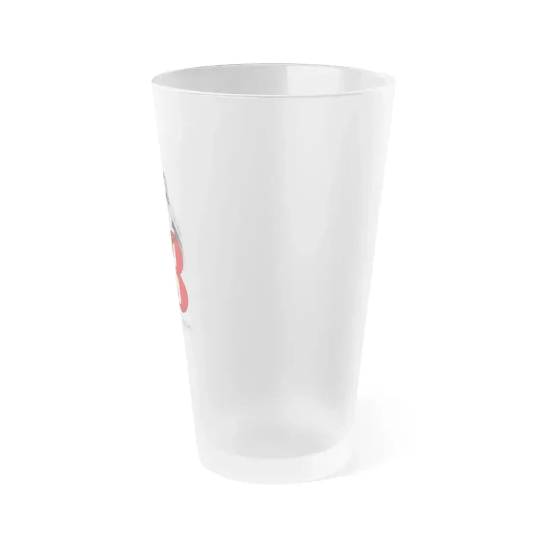 Frosted pint glass (16 oz / ≈0.47 L) with a soft matte finish and semi-translucent, one-sided print. Tough enough for bar and restaurant use, dishwasher safe, and BPA-free — a modern take on classic pintware.