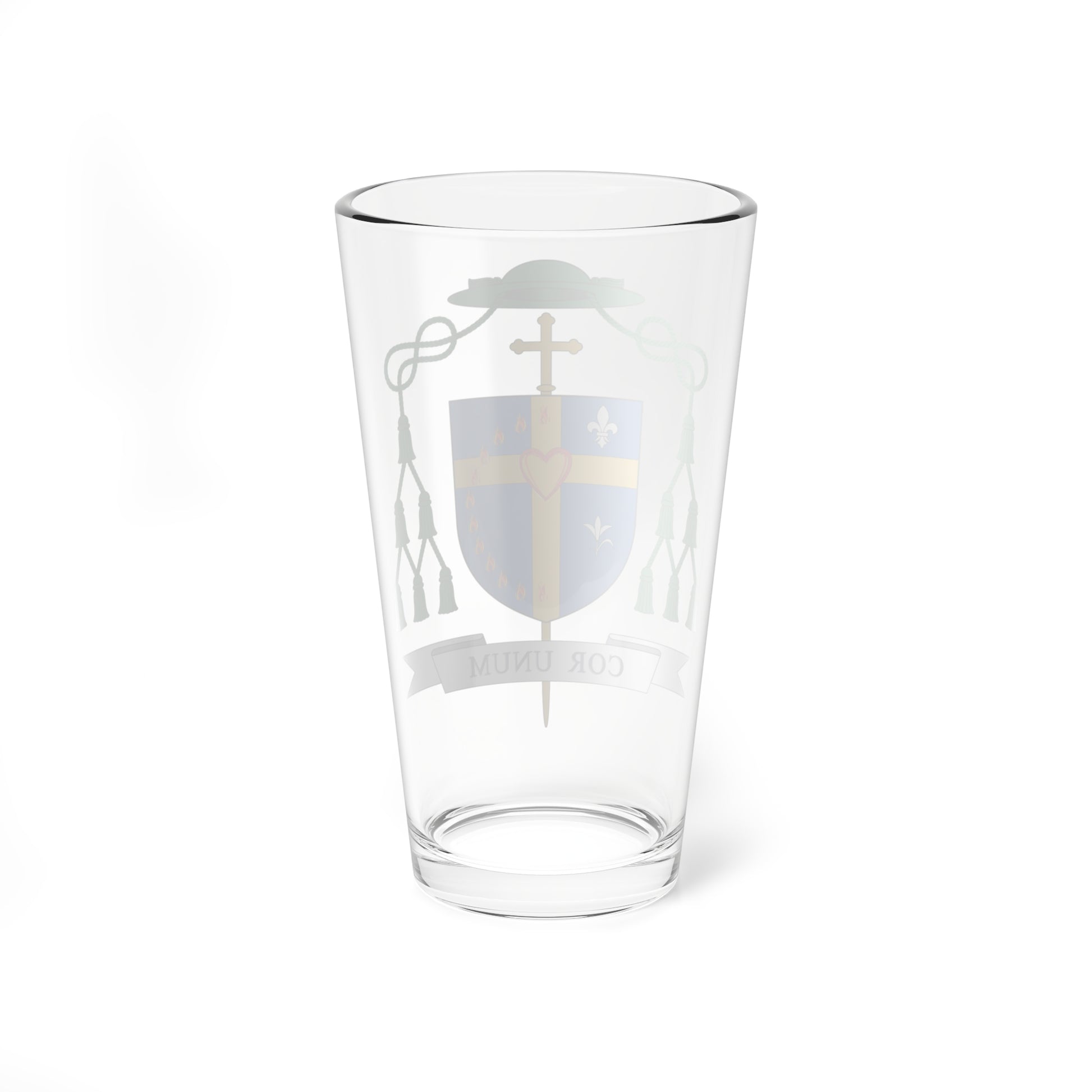 This pint glass showcases the heraldic artistry of Bishop Wilson Luís Angotti Filho, specifically his personal coat of arms. The design, a testament to his ecclesiastical office, is rendered with symbolic precision and vibrant colors. The centerpiece is a shield, filled with meaningful elements.