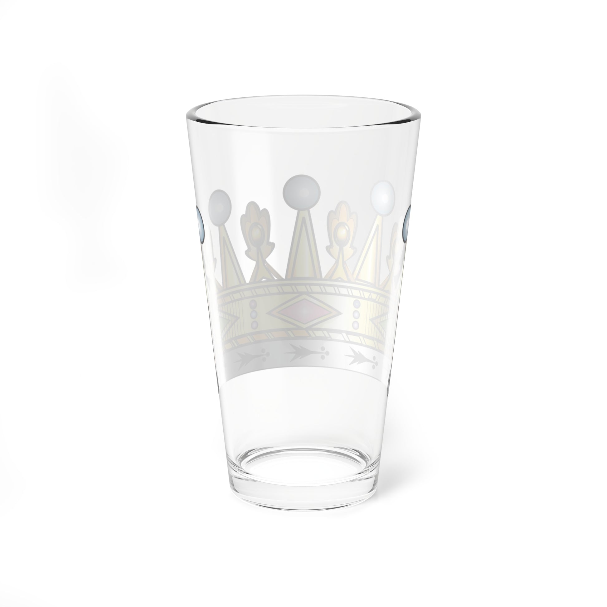 The design emblazoned upon this pint glass showcases the majestic coat of arms of the United Kingdom. This heraldic display is a powerful statement of royal heritage and national identity, rendered in precise detail to capture the essence of British symbolism.