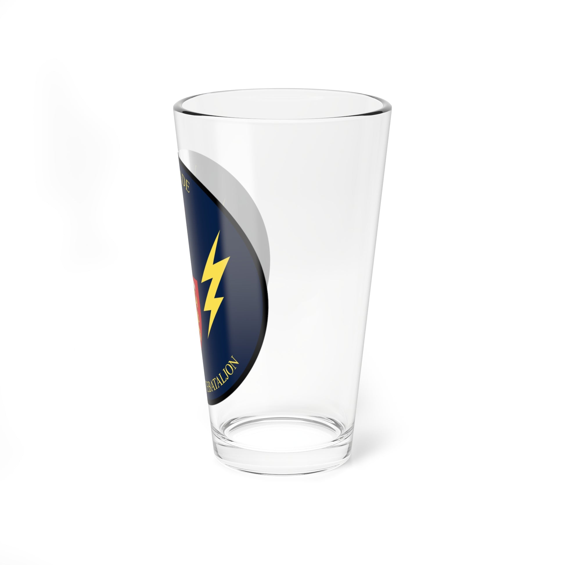 This pint glass showcases the distinctive emblem of the 1st Battalion, Fod/Slesvig Fodregiment (I-FSR) of the Danish Army. The design, originating from the "SVG military coats of arms of the Royal Danish Army" collection, is faithfully reproduced on the glass.