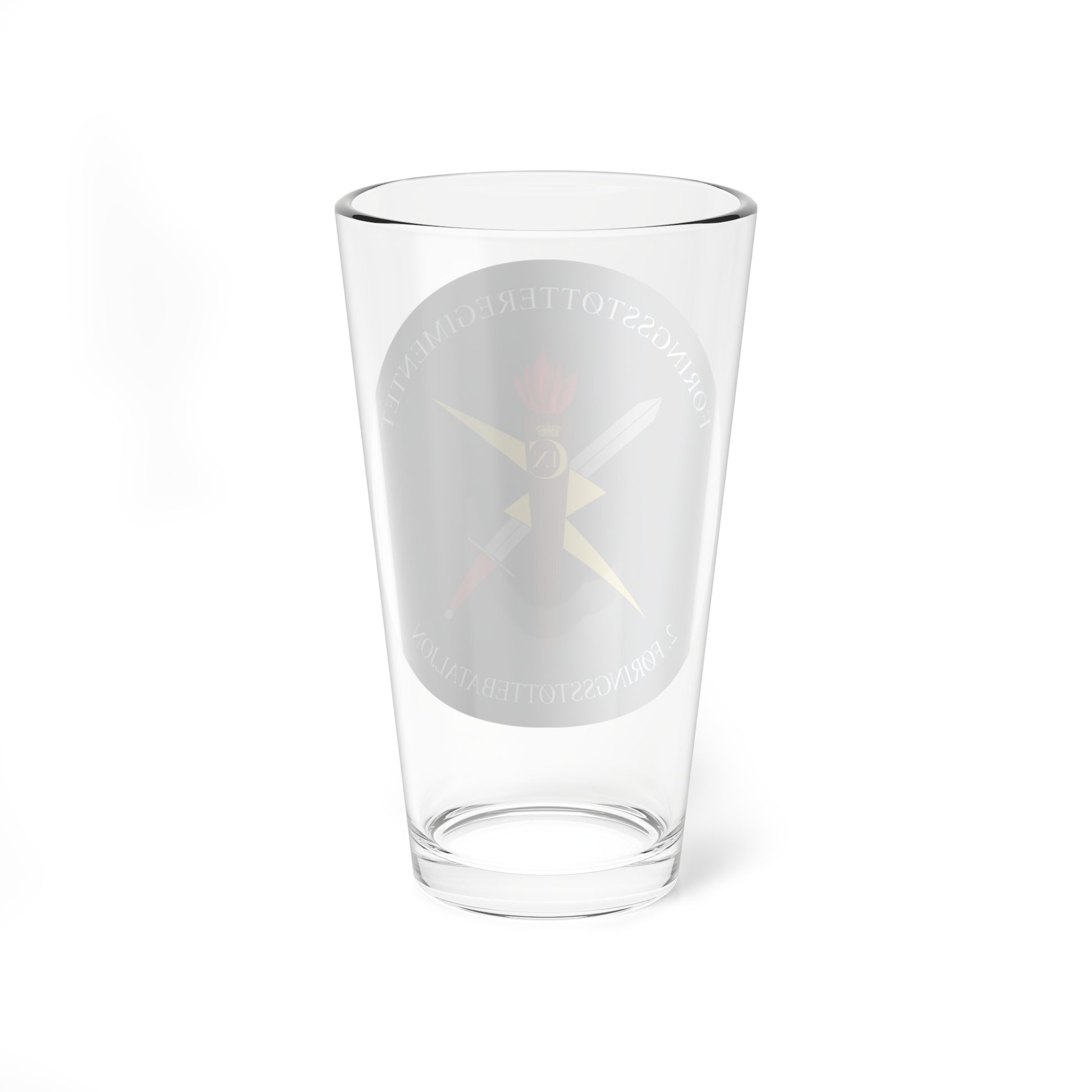 This pint glass showcases the distinctive emblem of the II-FSR, the 2nd Battalion of the Fjernstyrings-/Support-/Reconnaissance unit within the Royal Danish Army. The design, originating from the "SVG military coats of arms of the Royal Danish Army" category on Wikimedia Commons, is rendered with the precision of a vector graphic, offering crisp lines and clarity to the heraldic details.