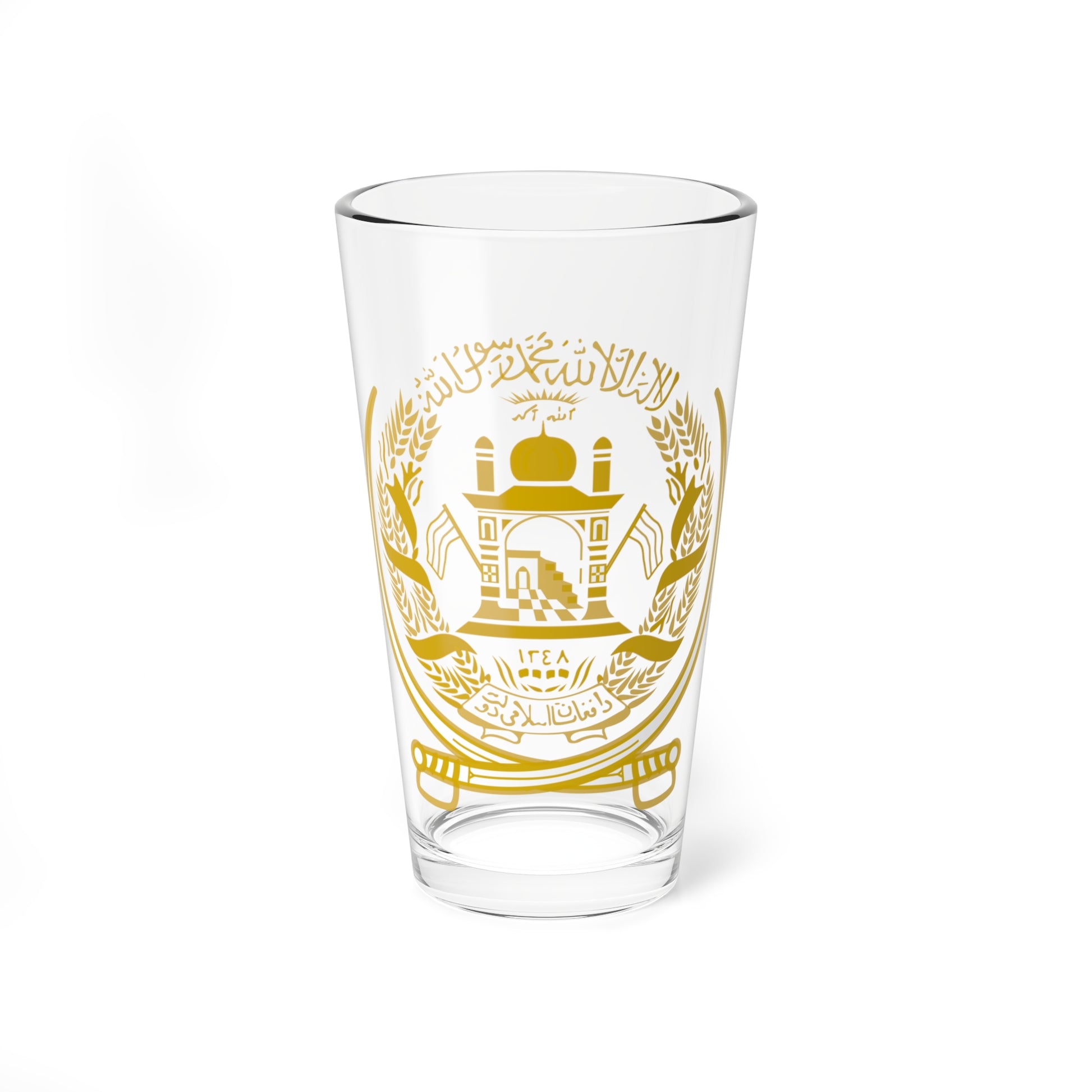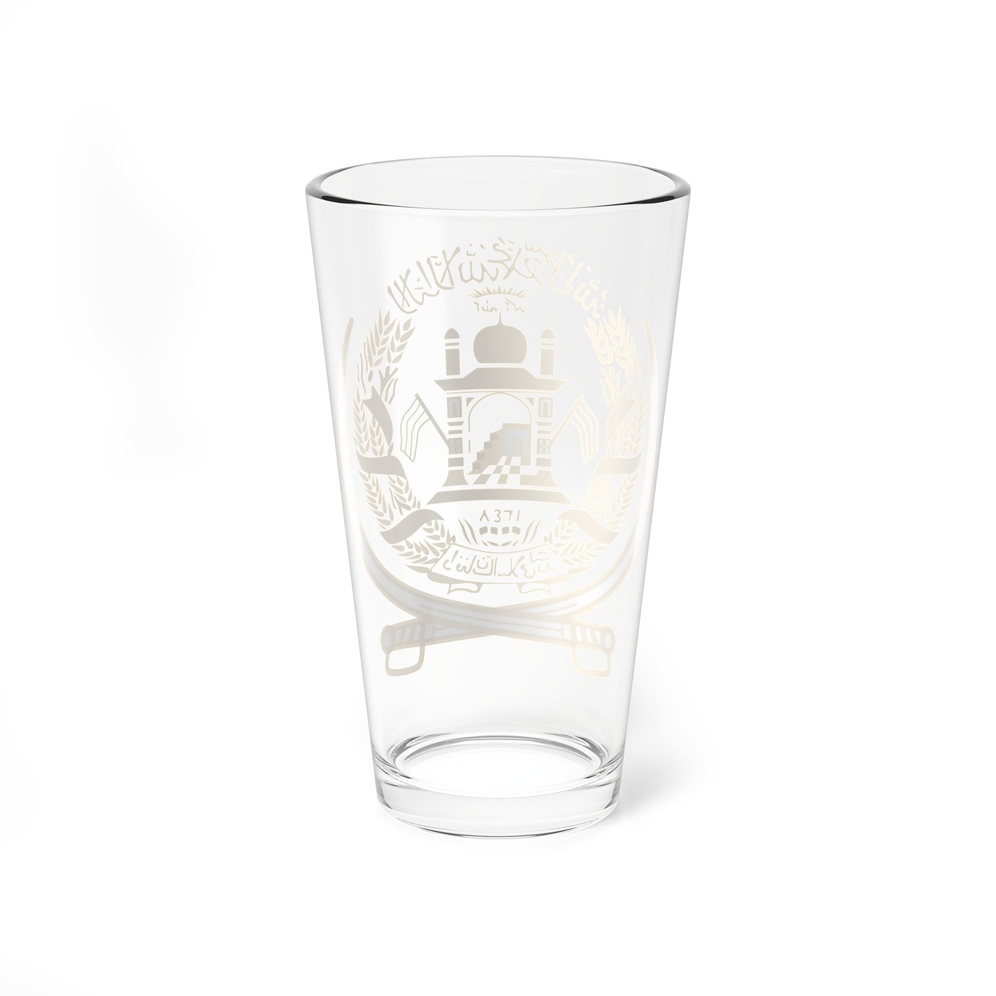 This pint glass showcases the historic Emblem of Afghanistan used from 1992 to 2002, a visual testament to a pivotal era in the nation's history. The design centers on the powerful symbolism of the Islamic faith and the nation's enduring spirit.