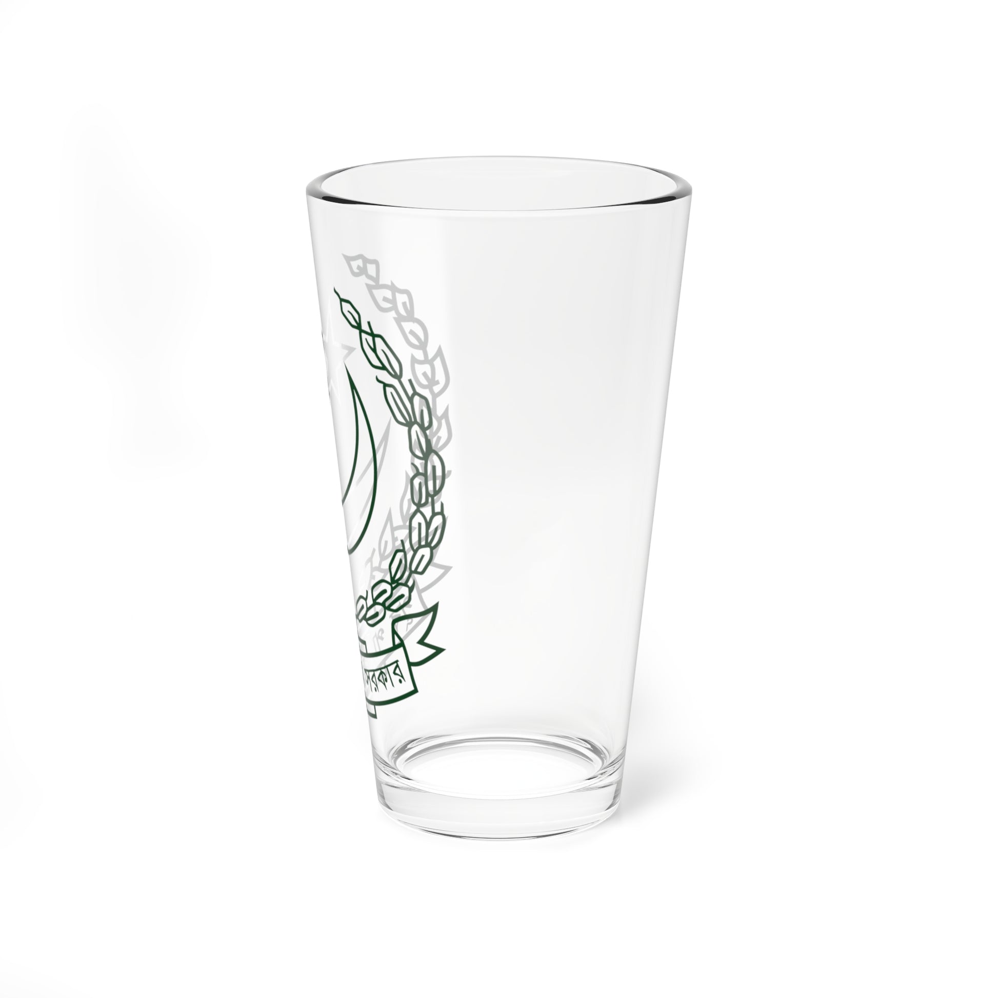 This pint glass showcases the "green version" of the official emblem of East Pakistan, as used by its provincial government during the pivotal years of 1970-1971. The design is a historical testament to a specific era and political identity.