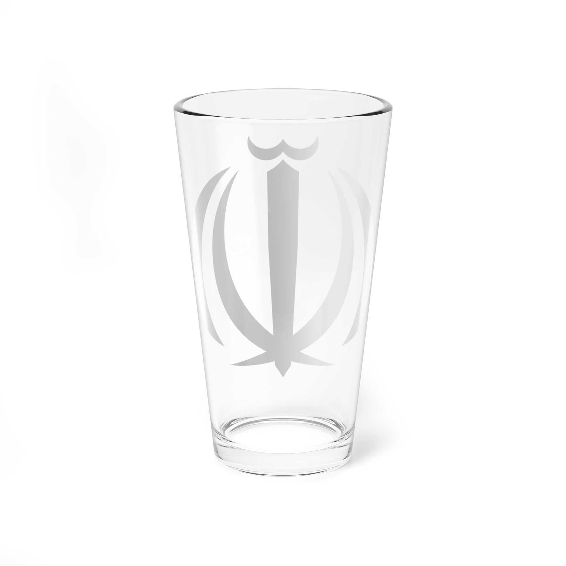 This pint glass showcases the Emblem of Iran, the national coat of arms of the Islamic Republic of Iran. The design is a powerful and instantly recognizable symbol, deeply rooted in religious, national, and political significance.