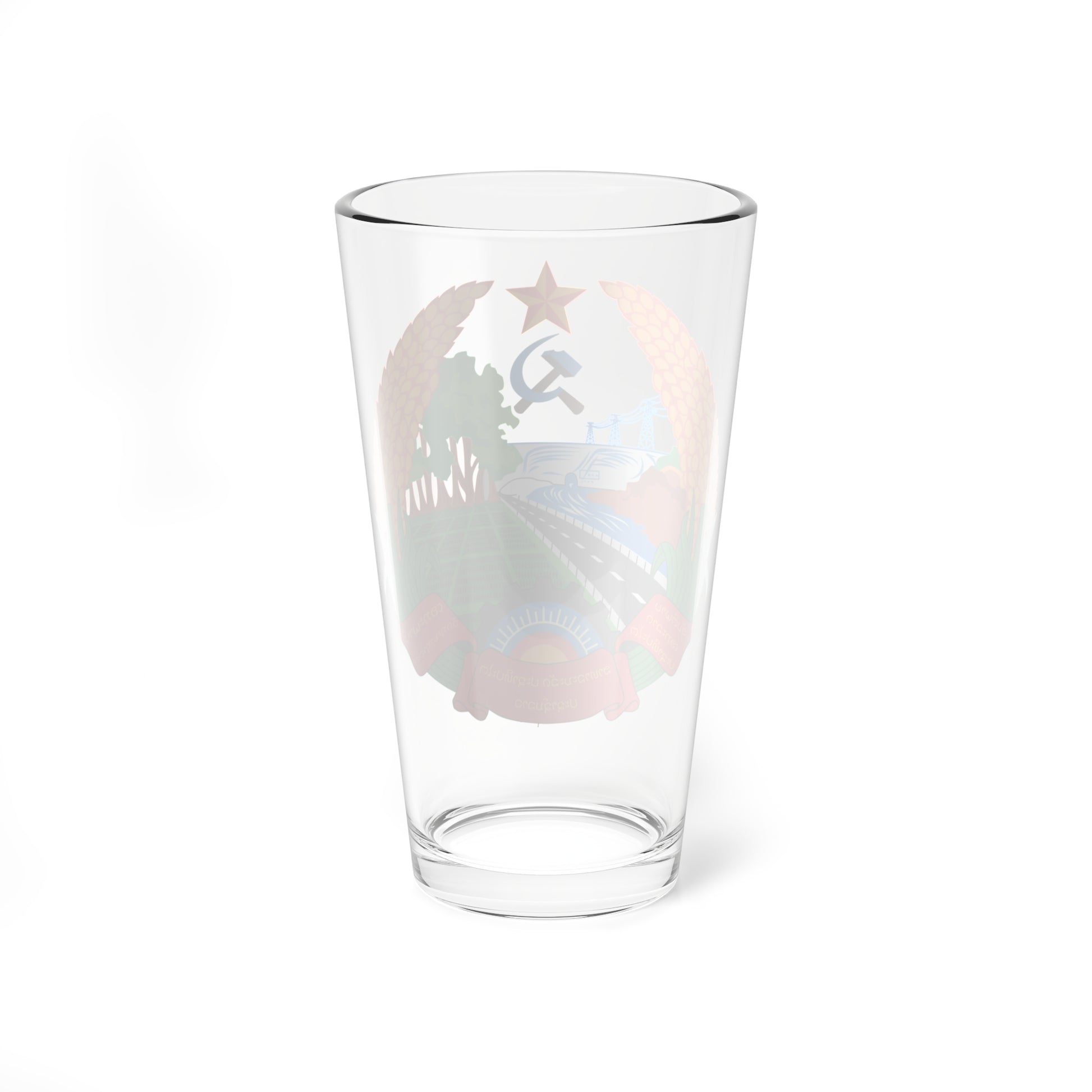 This pint glass showcases the Emblem of Laos used by the Lao People's Democratic Republic from 1975 to 1991, a striking symbol of the nation's identity and aspirations during that era. The design is a vibrant representation of socialist ideals and national pride, rendered in the characteristic style of socialist realism.