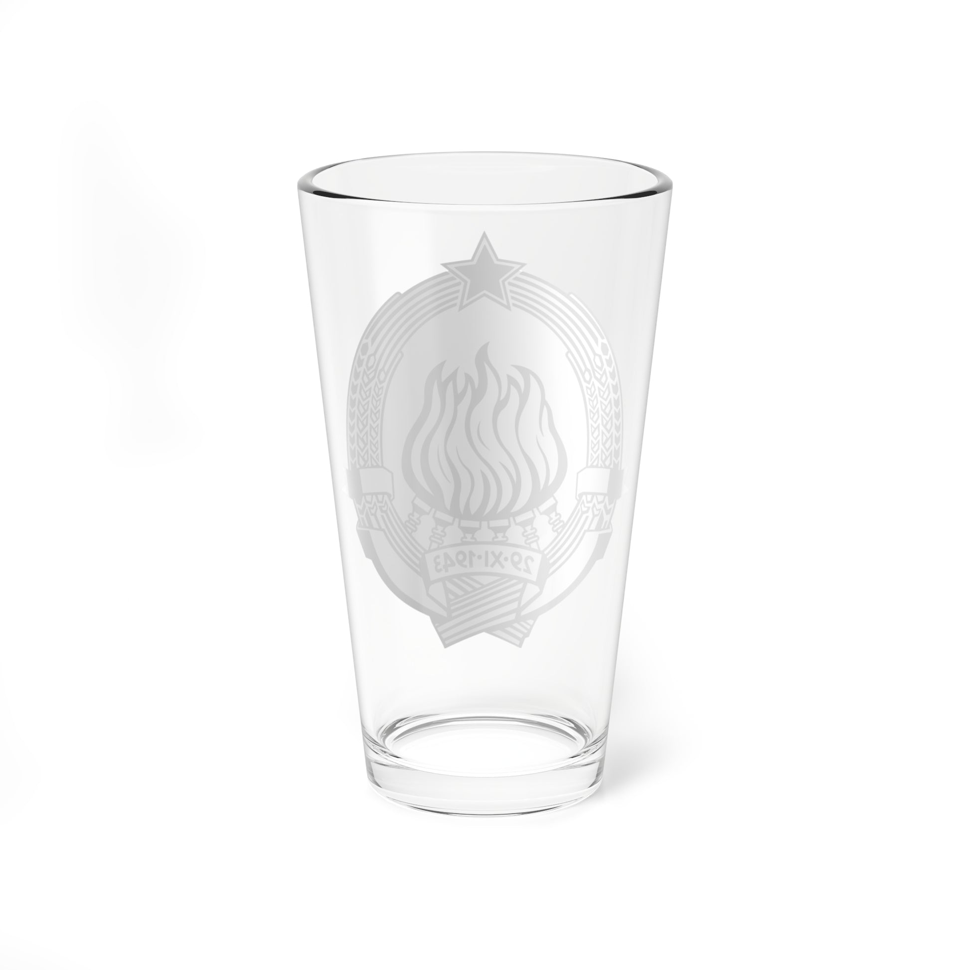 This pint glass features the stark and powerful "stamp version" of the Emblem of the Socialist Federal Republic of Yugoslavia (SFR Yugoslavia), the official coat of arms used during the Yugoslav era.