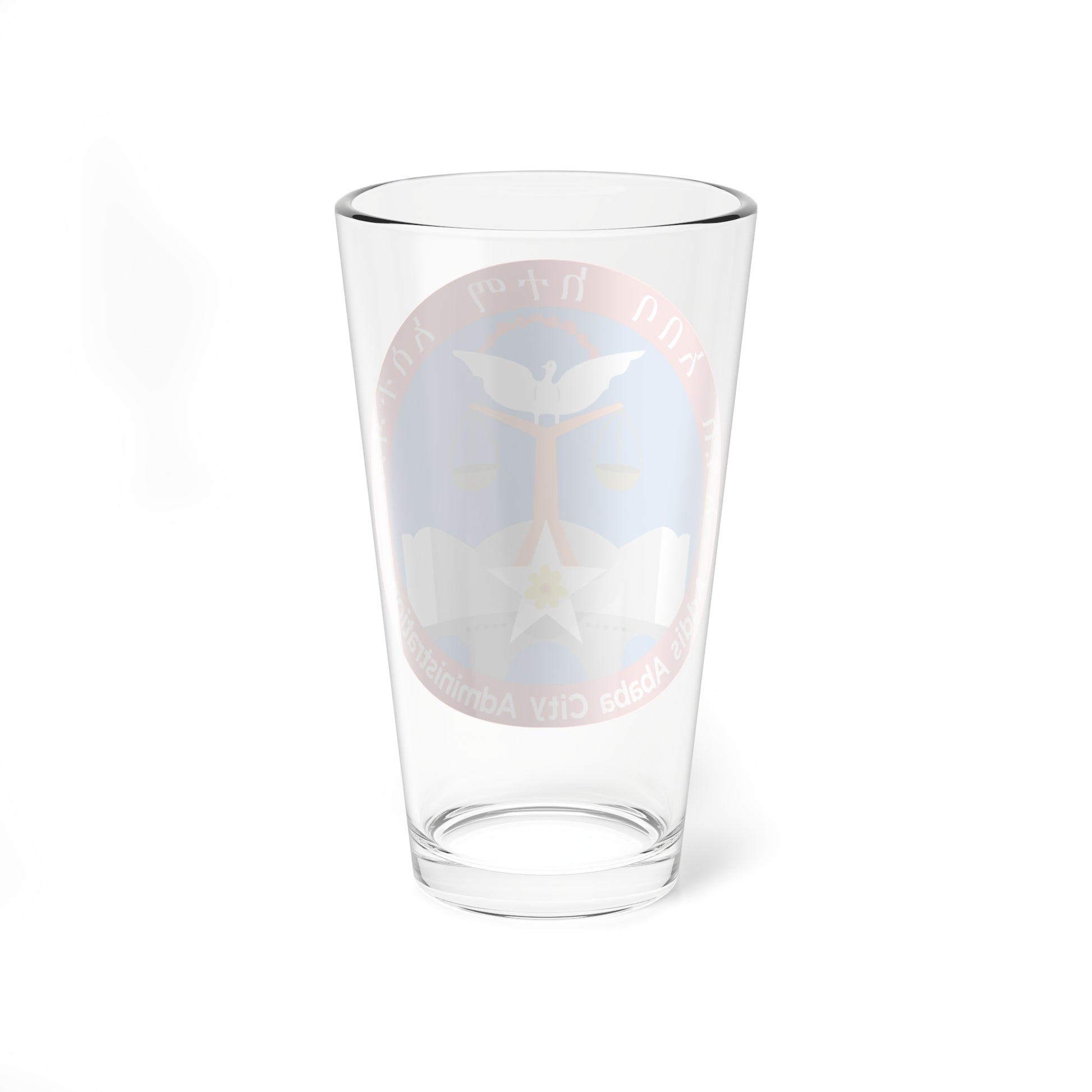 This pint glass showcases the official emblem, or coat of arms, of the Addis Ababa City Administration, the heart of Ethiopia’s capital. The design, rendered in a circular seal format, embodies the city's identity and administrative importance.