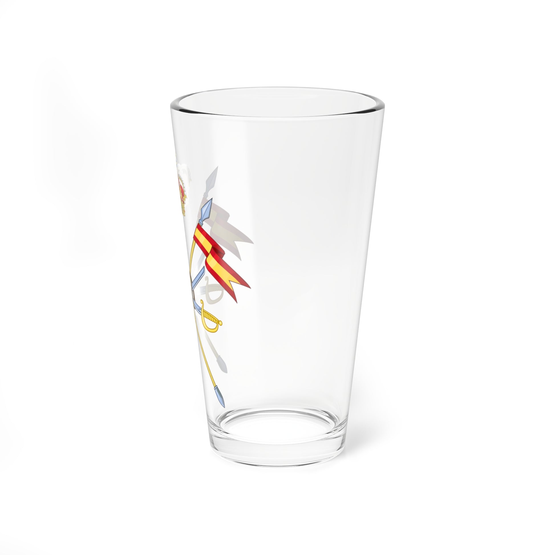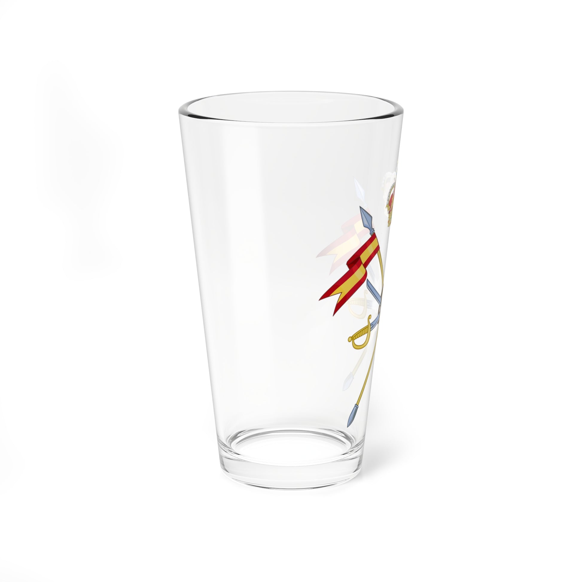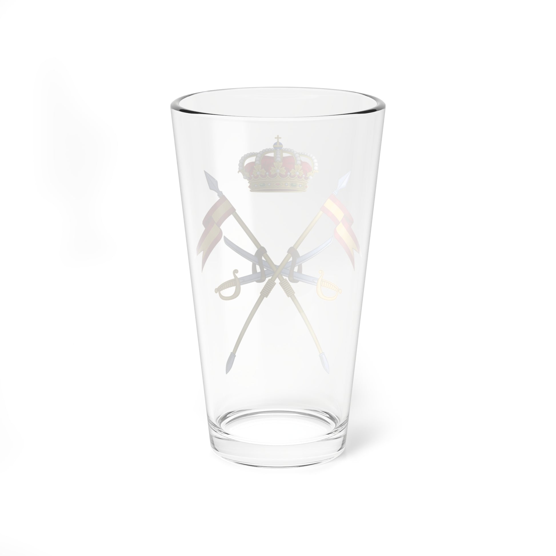 This pint glass showcases the powerful and symbolic Emblem of the Cavalry Forces of the Spanish Army. The design centers around a shield, or coat of arms, a key element of Spanish military heraldry.