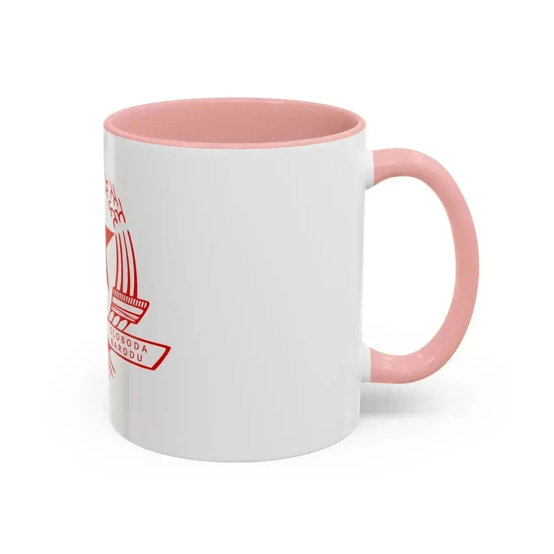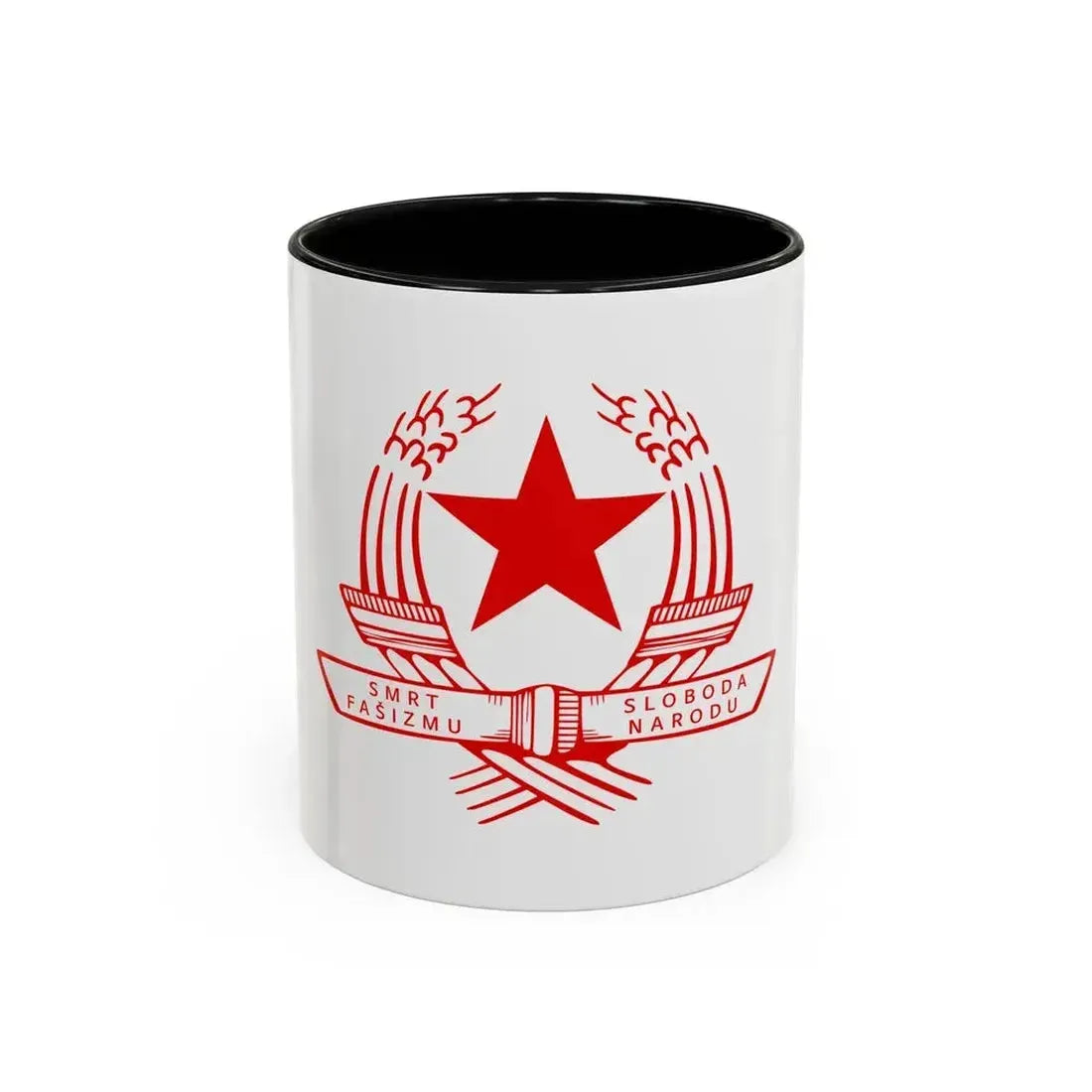 This Accent Coffee Mug showcases the Emblem of the State Anti-fascist Council for the National Liberation of Croatia, a historical symbol that represents resistance and unity during World War II. The design features an interwoven tricolor band, enclosed by a wreath of oak leaves and a five-pointed star, all emblematic of the council's struggle against fascism. This mug serves as a thoughtful reminder of Croatia's rich history, making it perfect for anyone with an interest in history or appreciation for unique and cool drinkware.