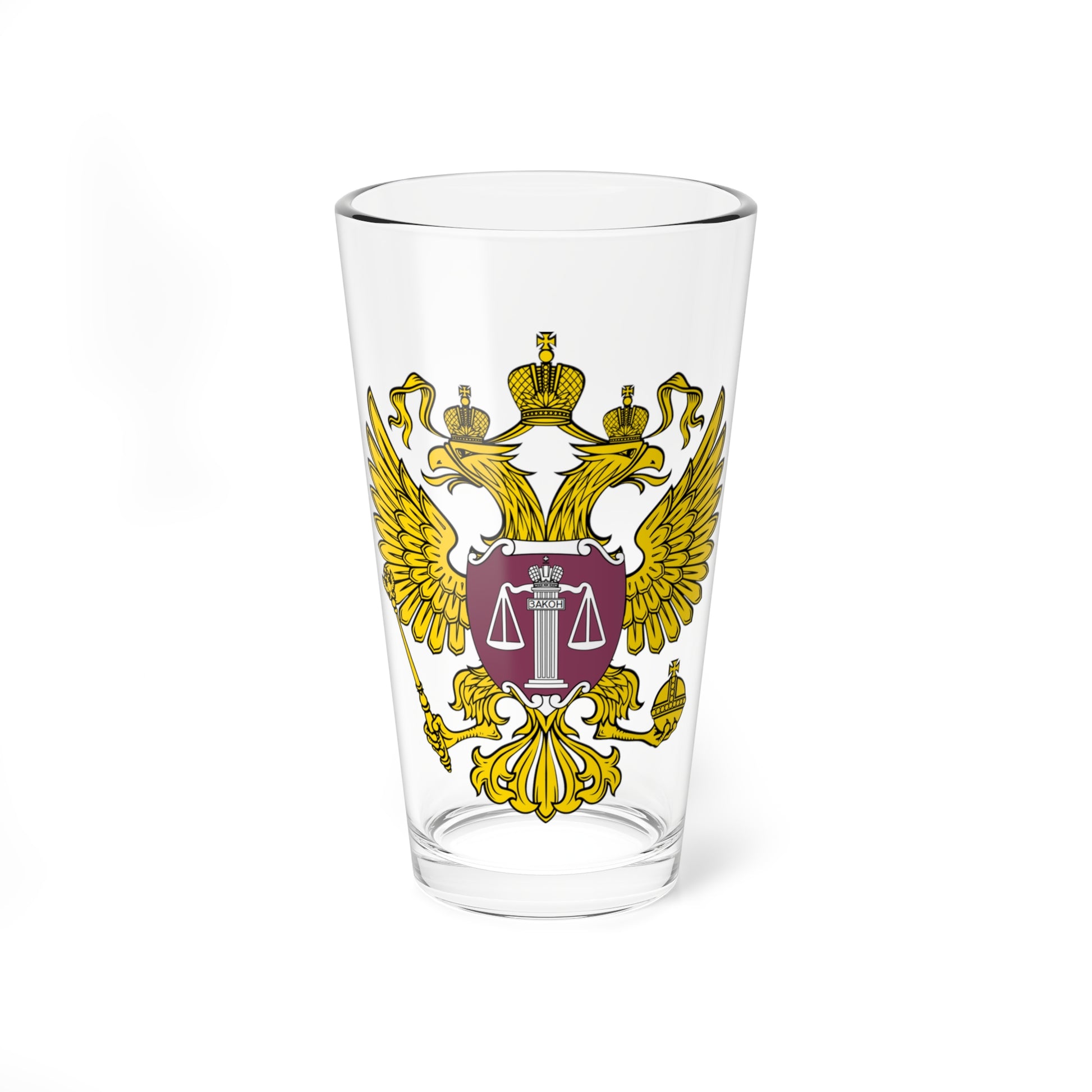 Hey there, drinkware enthusiasts! 🍻 This pint glass is a beauty, featuring the majestic Emblem of the Supreme Court of Russia. It's like a mini-museum right in your kitchen! πŸ–ΌοΈ The Russians take their judicial system seriously, and their highest court's emblem reflects that. It's got a double-headed eagle, the symbol of Russia, clutching a scepter and orb – classic signs of power. And guess what? There's even a shield on its chest with some fancy design. πŸ¦…πŸ† So, if you're a fan of Russian history and justice, for you. It's not just a drinkware – it's a piece of Russian cultural heritage! ✨