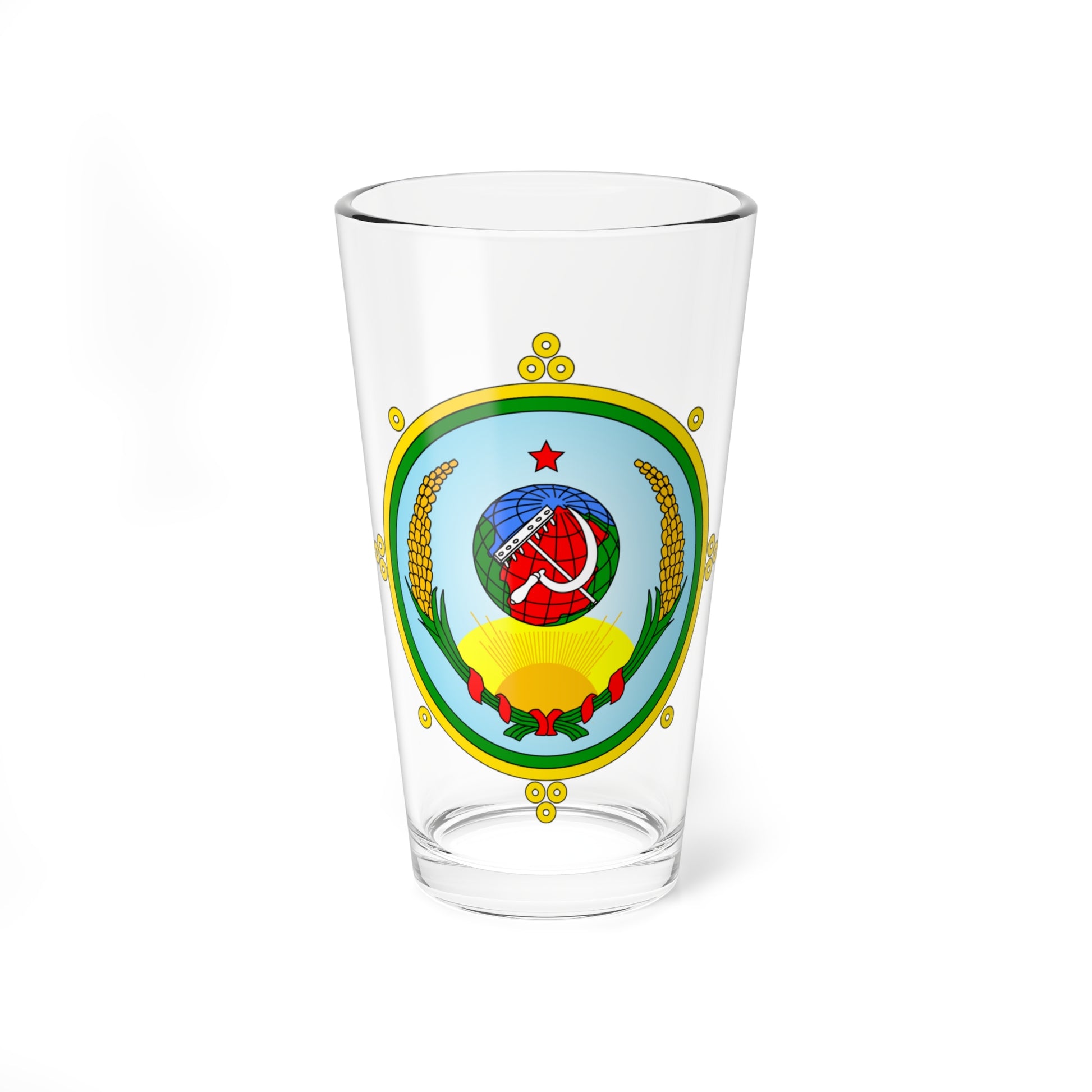 Hey there, check out this epic pint glass! It's got the dazzling emblem of the Tuvan Peoples Republic from the Soviet Union right on the front. Talk about a piece of history! from the golden age of the Soviet Union, 1926-1930. The emblem features a stunning globe surrounded by a radiant sunburst, with a pair of crossed sickles and rakes flanking it. And get this, the whole thing is framed by a leafy wreath of ears – kinda creepy, but hey, it's got history! So if you're a fan of vintage Soviet memorabilia or just love a unique glass, this one's a must-have. It's got that old-school charm with a dash of historical significance. Cheers!