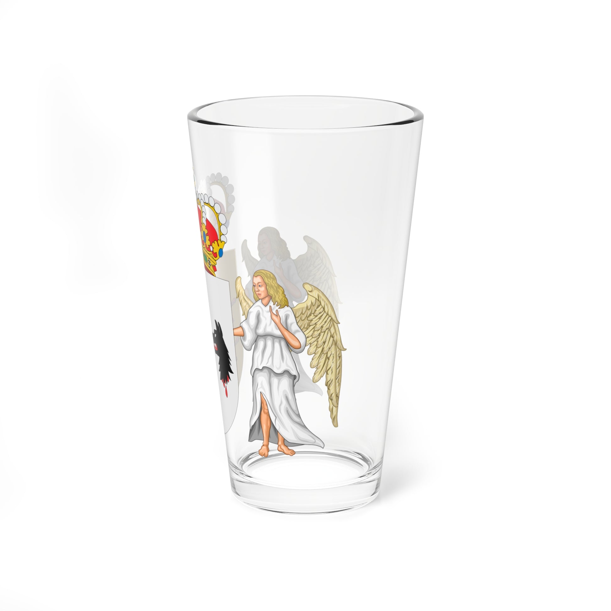 This pint glass showcases the distinguished coat of arms (Escudo) of the Casa de Osorio de Moscoso, a noble lineage originating from Portugal. The design prominently features the family's heraldic emblem, rendered in striking detail.