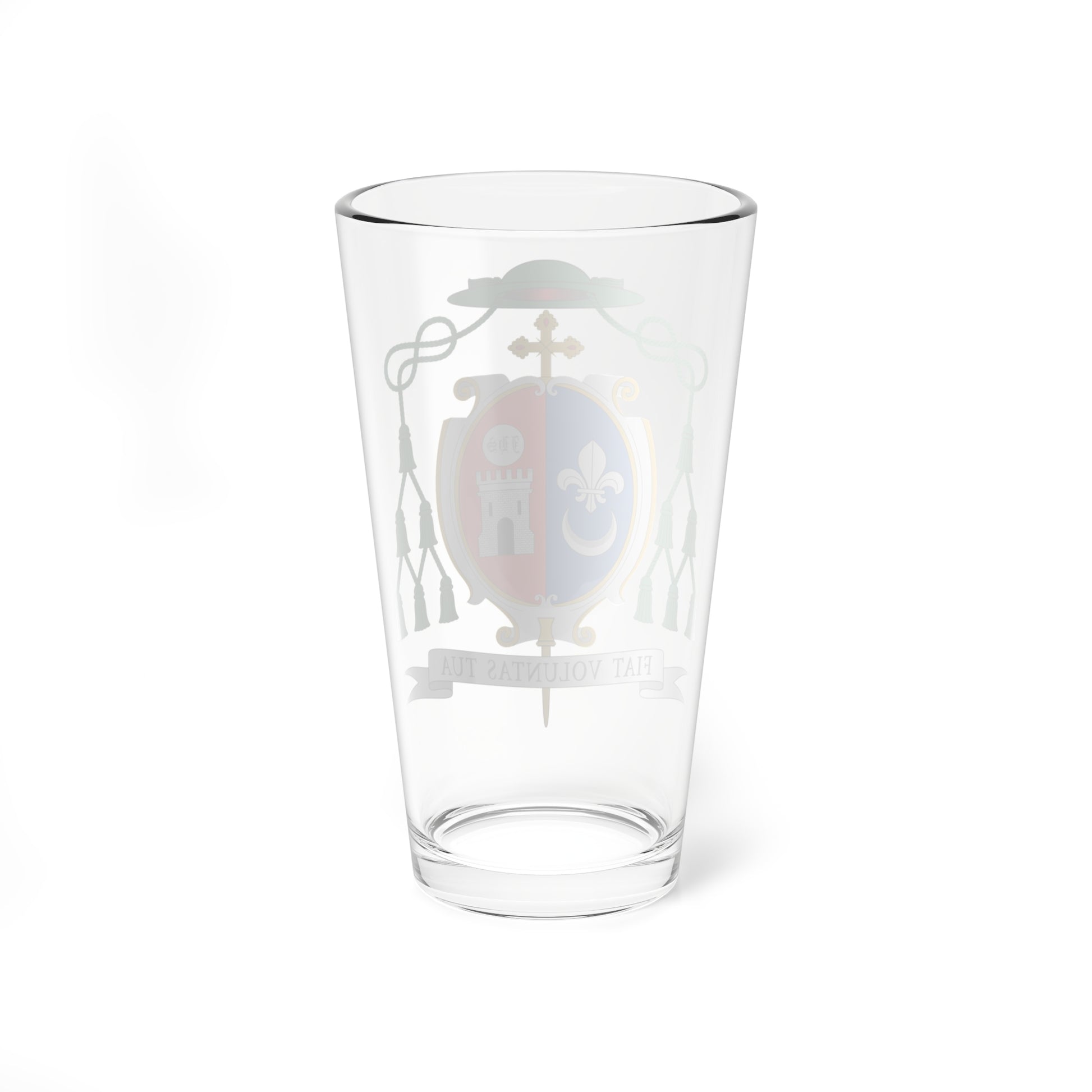 This striking design features the ecclesiastical coat of arms of Bishop Adair José Guimarães, rendered for a pint glass. The artwork's central element is the shield, meticulously divided into two distinct sections.