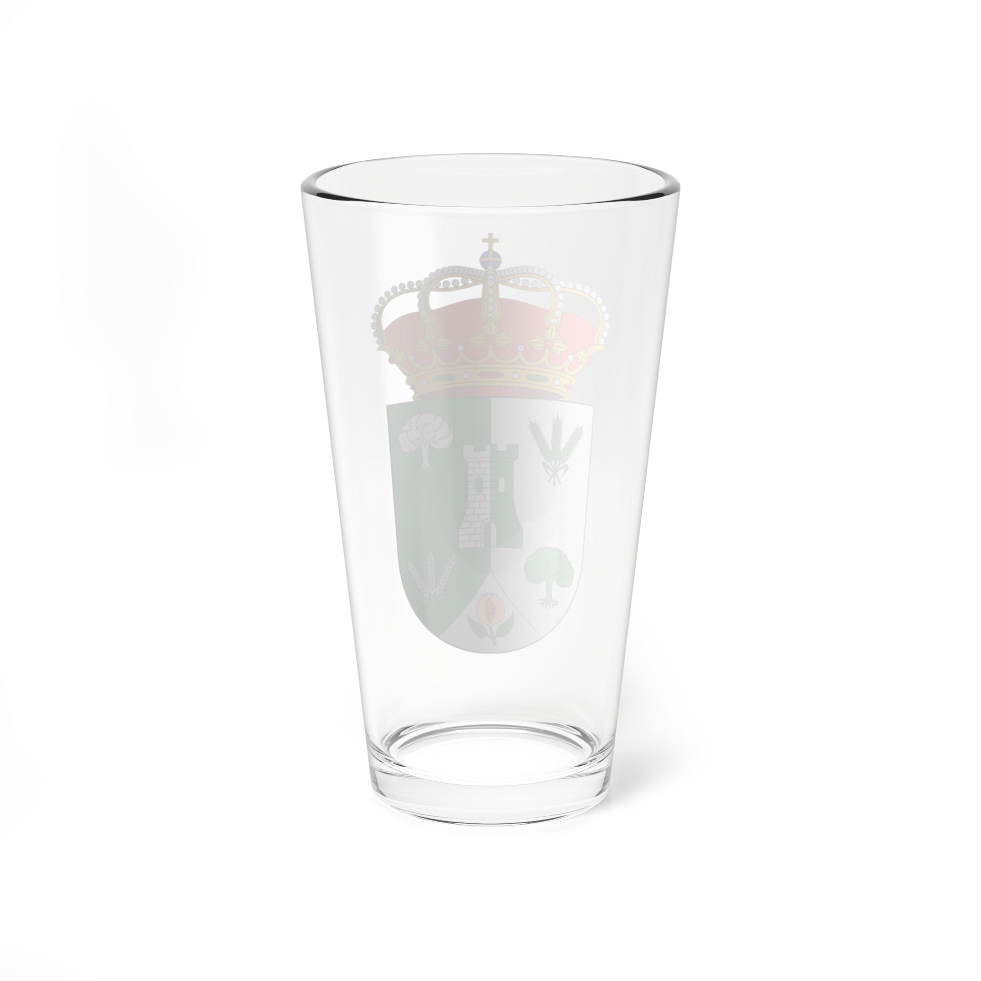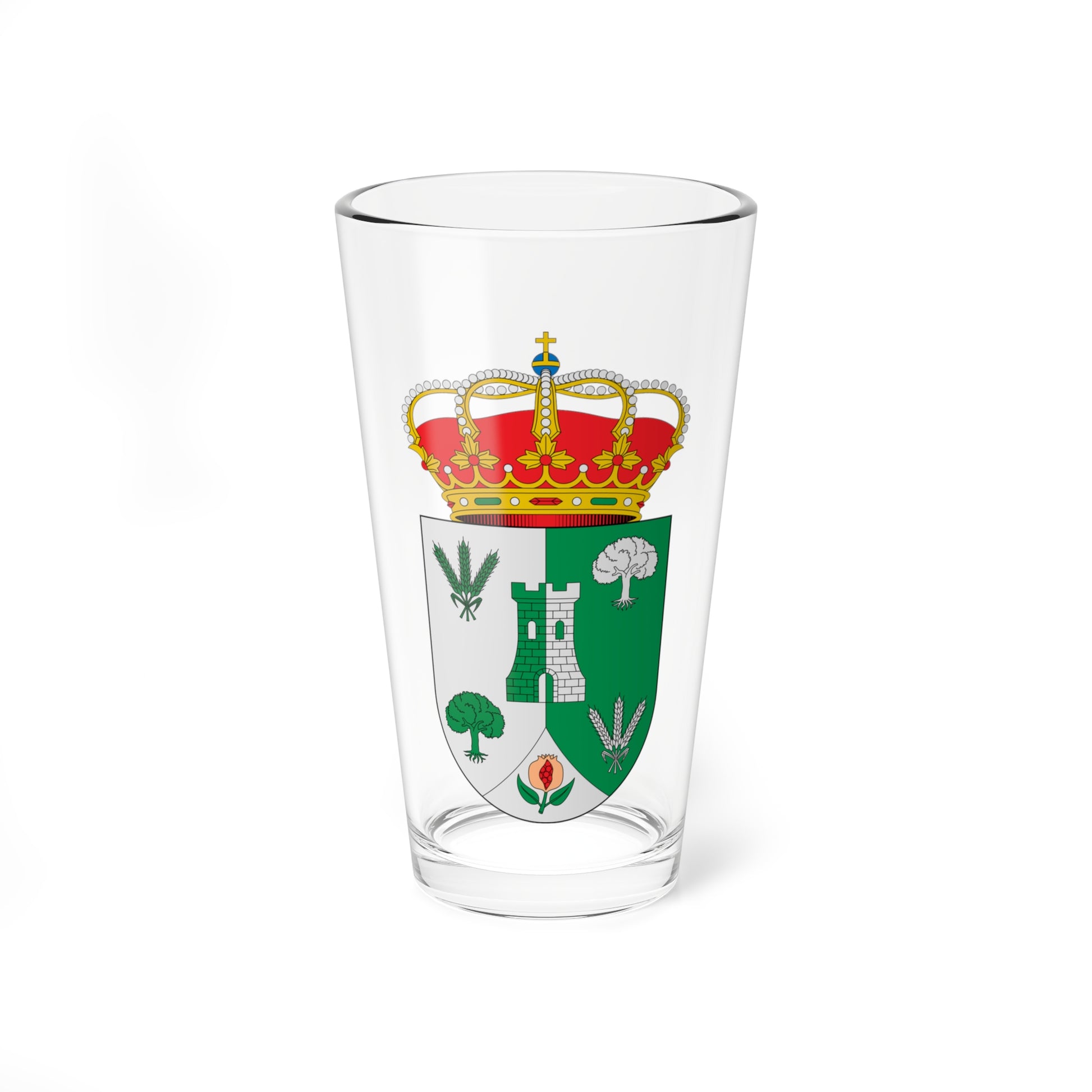 This pint glass showcases a design derived from the coat of arms of Agrón, a municipality in the province of Granada, Spain. The artwork faithfully replicates the heraldic emblem, offering a visual testament to Agrón's heritage.