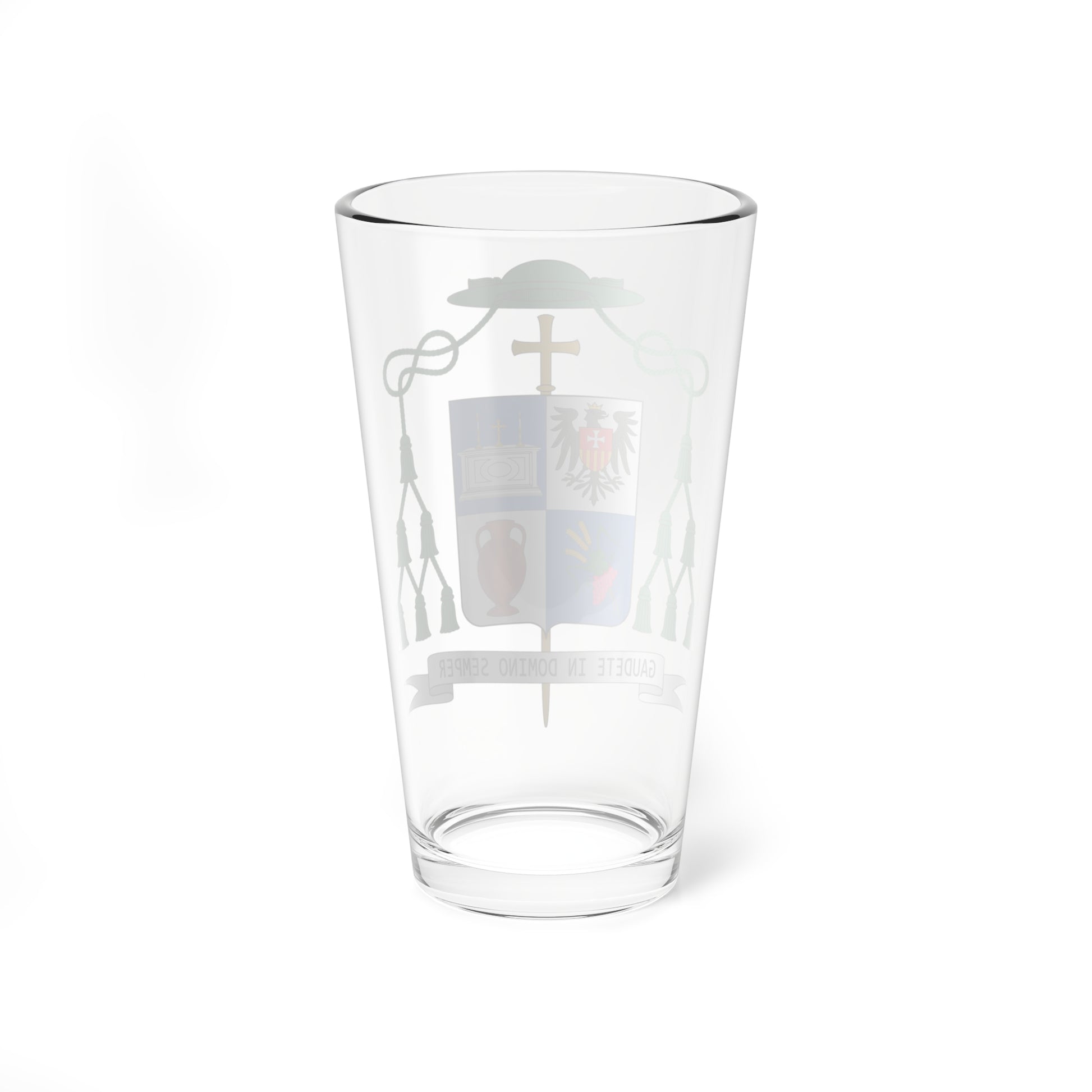 This pint glass features the intricate and symbolic design of the Escudo de Alberto Vera Aréjula, the personal coat of arms of a Catholic bishop. The artwork is a visual representation of his vocation, mission, and spiritual identity.