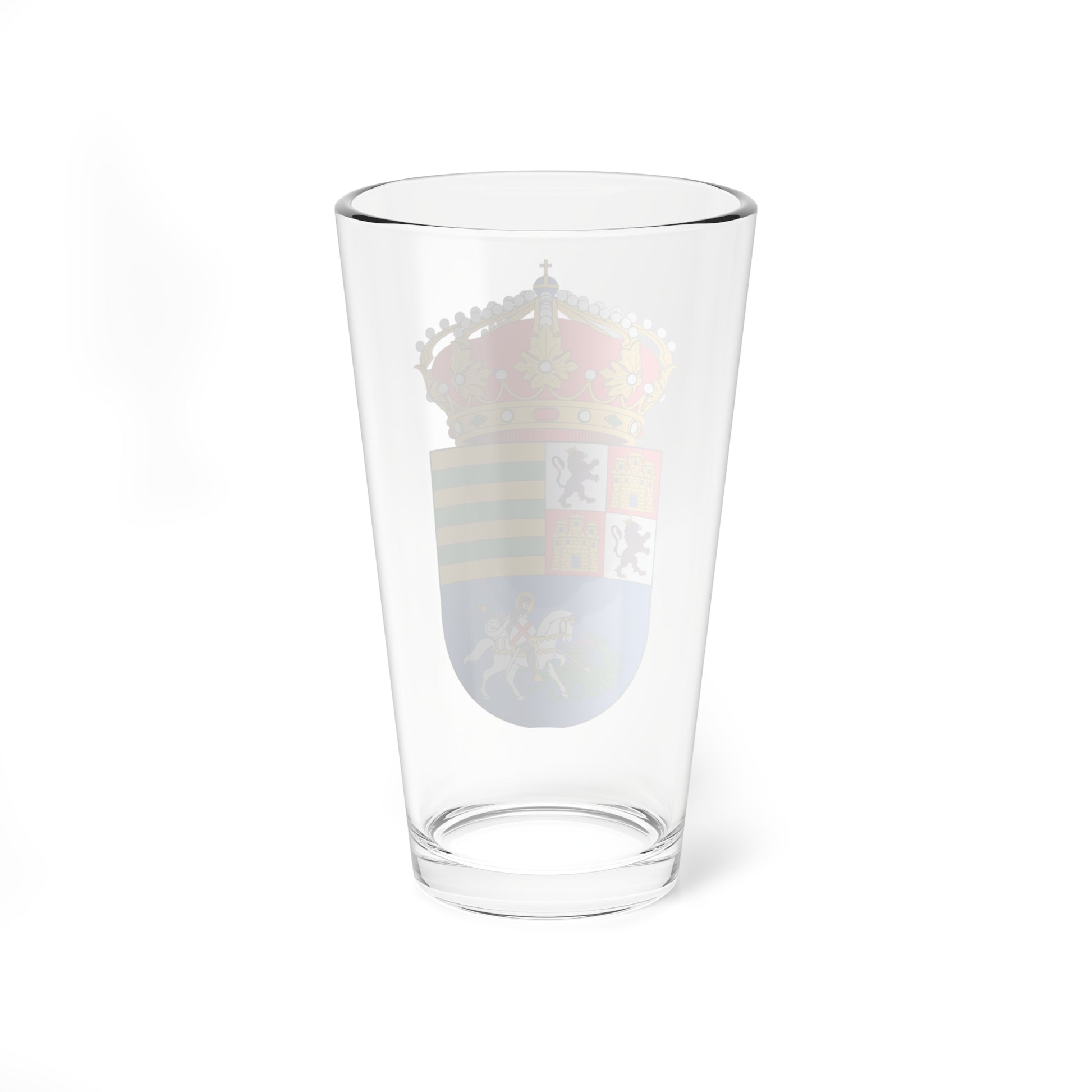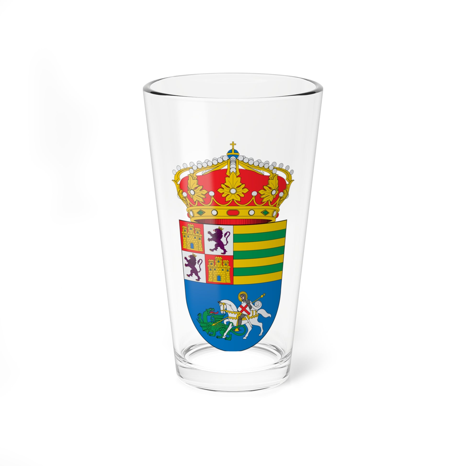 This pint glass showcases the vibrant and historically rich coat of arms of Alcalá de los Gazules, a municipality in Andalusia, Spain. The design is a captivating representation of the town's heritage and its connection to both the Spanish monarchy and its patron saint.