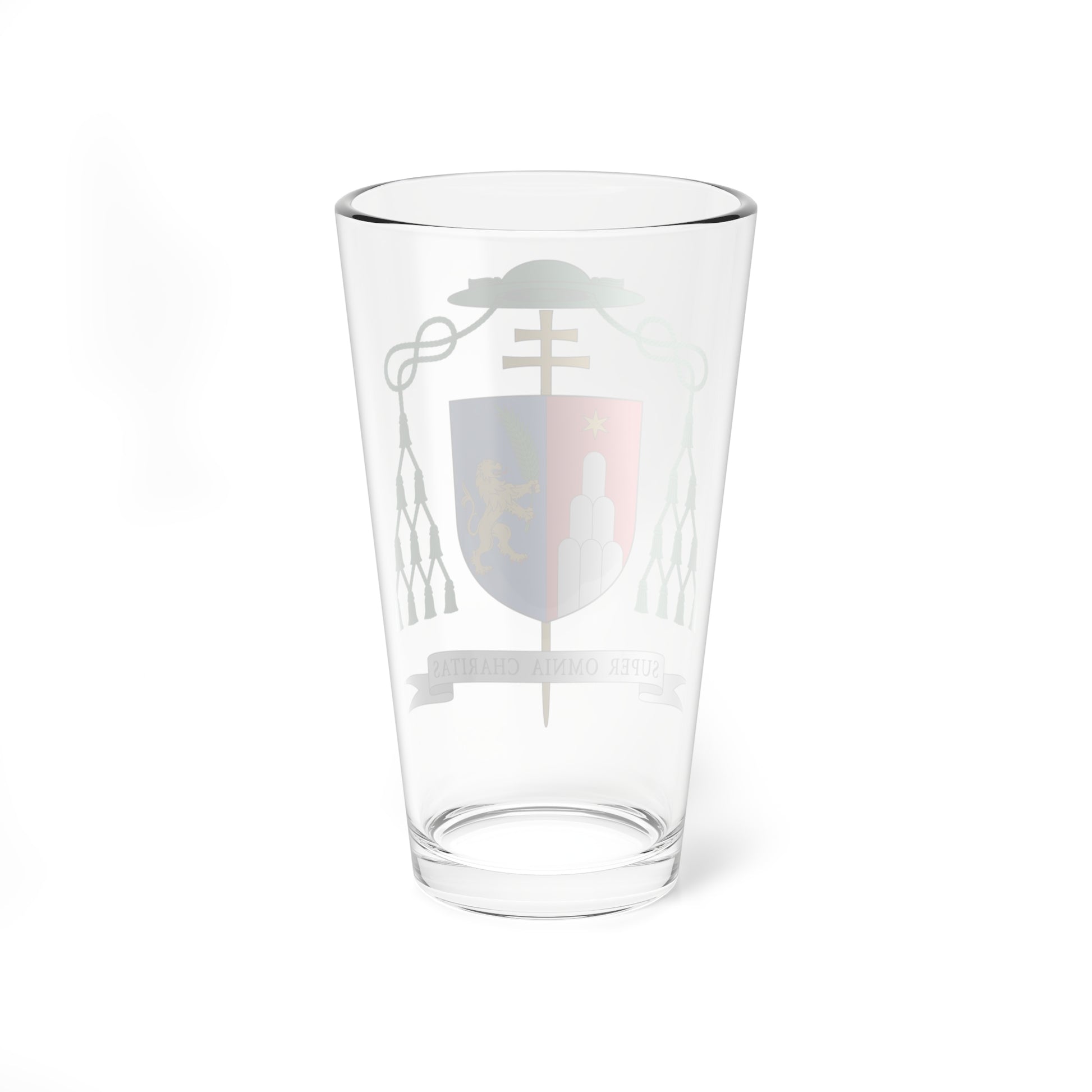 This pint glass showcases the striking personal coat of arms of Alfio Rapisarda, an Italian archbishop, presented within the traditional form of ecclesiastical heraldry. The design is rich with symbolism and color, offering a glimpse into the individual's faith and values.