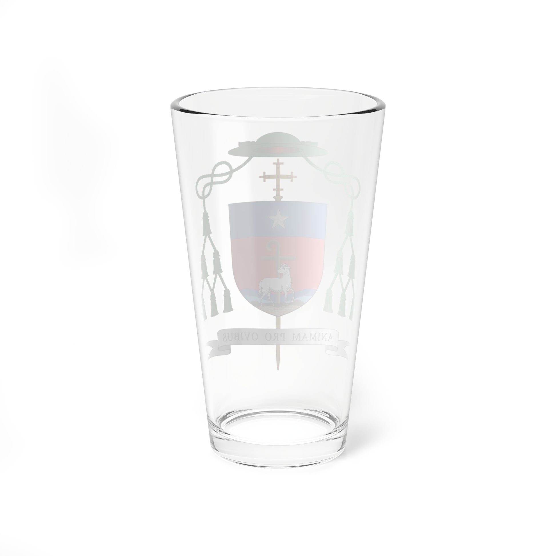 Imagine a glass with a colorful shield emblazoned on the front. This shield is like a family crest, belonging to a special bishop from Spain called Antônio Emídio Vilar. The design features a fluffy white lamb standing on a small hill, with a fancy shepherd's staff behind it. The whole thing is framed by a sky-blue and fiery red background, making it truly eye-catching!