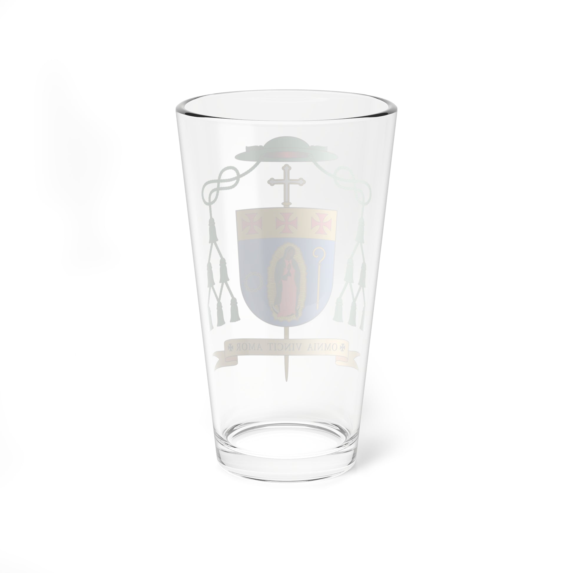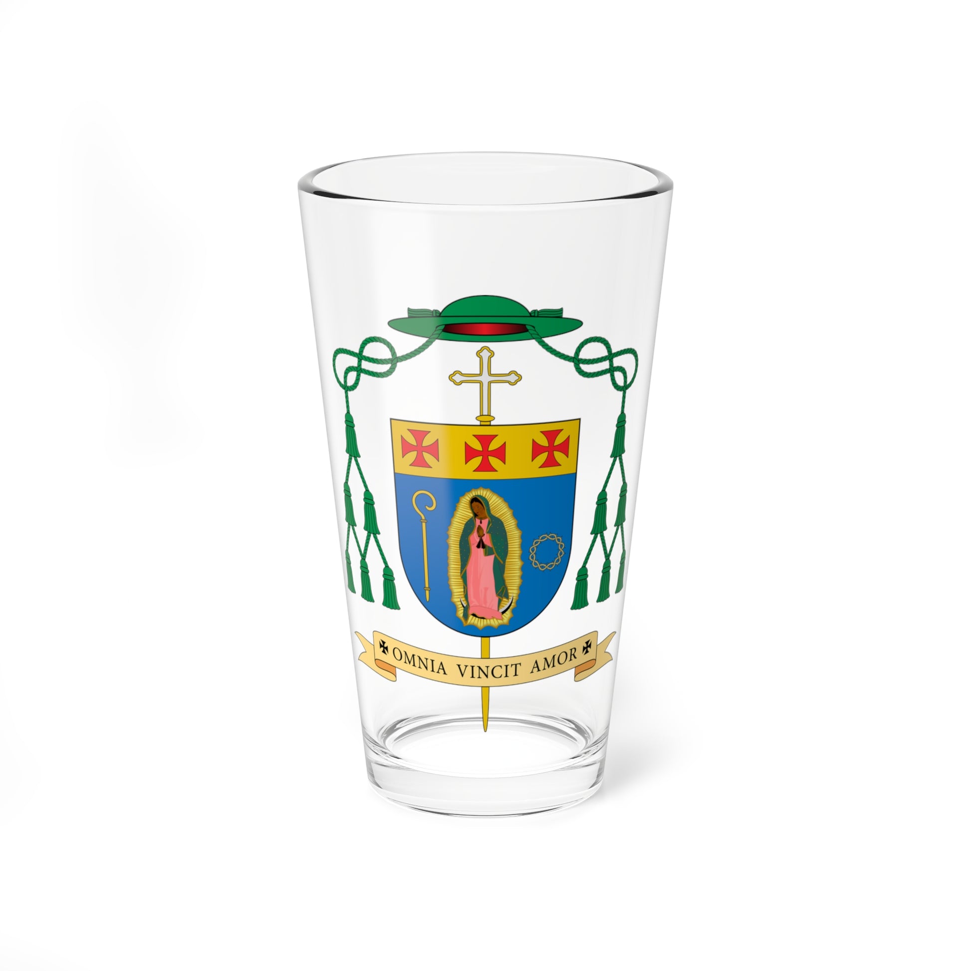So, this pint glass has a pretty cool design inspired by the coat of arms of Bishop Antônio Tourinho Neto, a Brazilian bishop. It's not your usual Spanish emblem, though. This shield features some fancy ecclesiastical stuff, like a cross and some fancy shapes that bishops often have on their coats of arms. The bishop's a big deal in Bahia, Brazil, and a way to celebrate his status and connection to the local community. It's pretty unique and would look super cool on your shelf or in your kitchen.