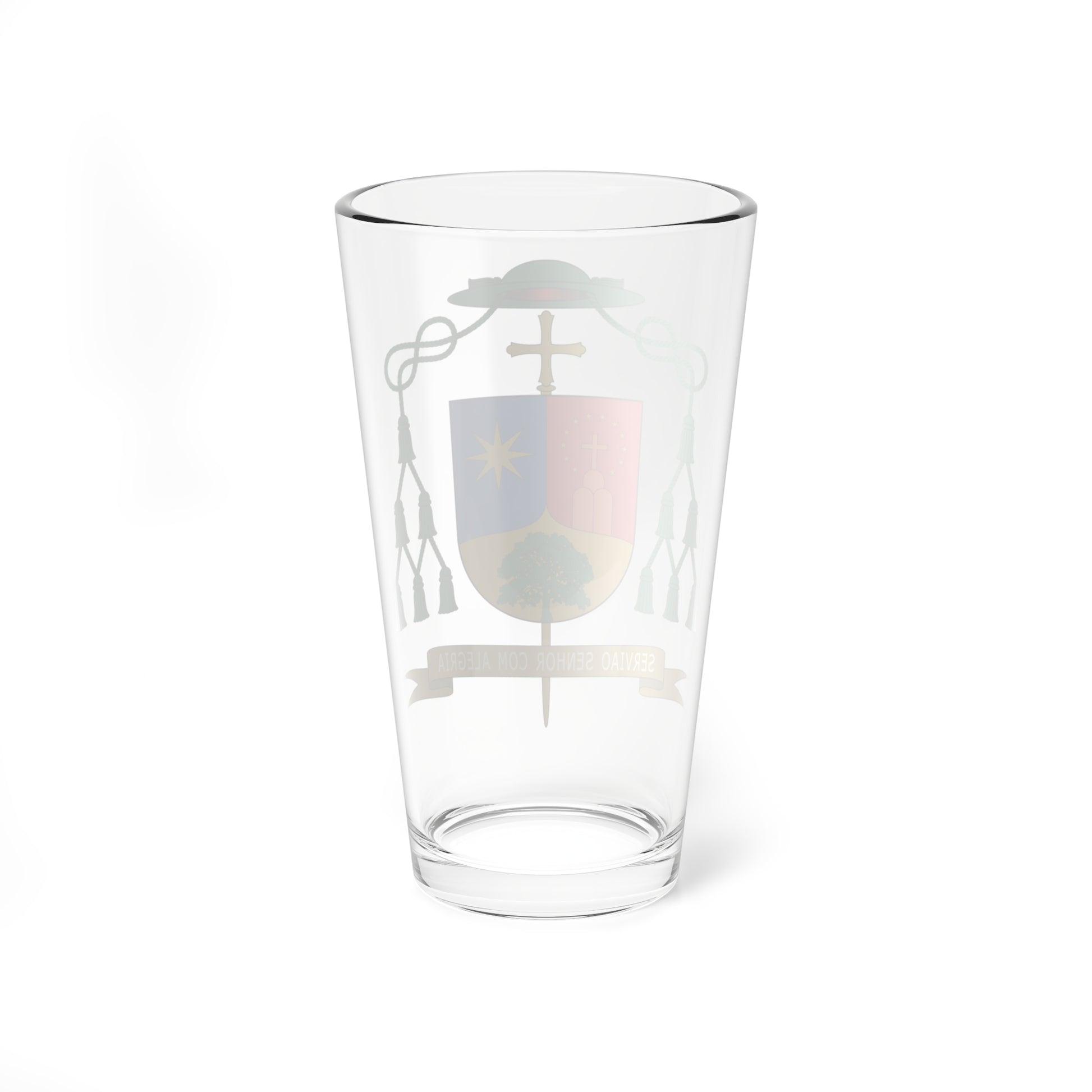 This pint glass showcases the "Escudo de Arnaldo Carvalheiro Neto," a personal coat of arms representing Dom Arnaldo Carvalheiro Neto, a Brazilian Catholic bishop. The design is a visual testament to his faith and pastoral role.